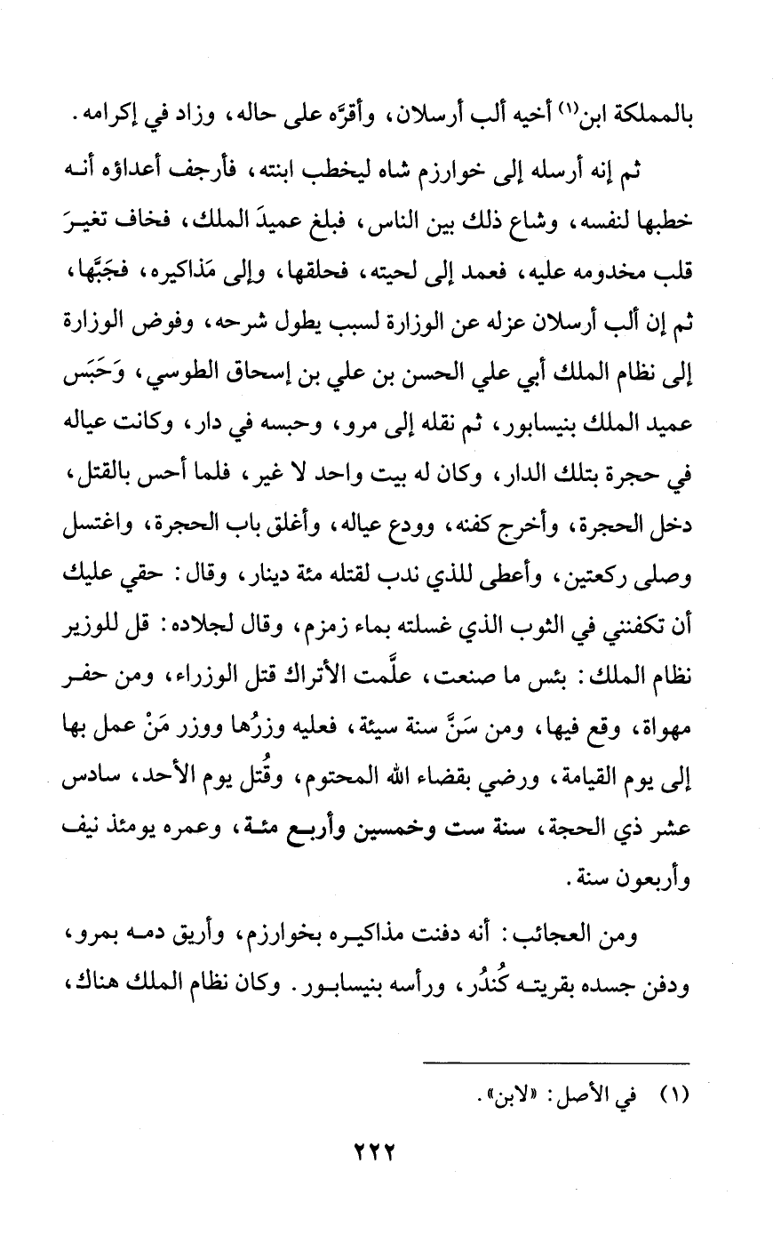 ومن العجائب: أنه دفنت مذاكيره بخوارزم، وأريق دمه بمرو، ودفن جسده بقريته كُندُر، ورأسه بنيسابور. وكان نظام الملك هناك،