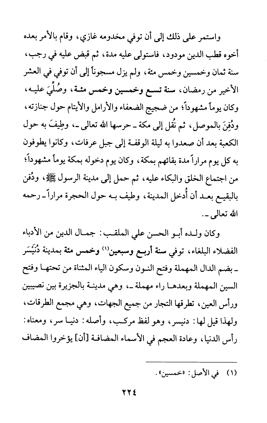 وكان ولده أبو الحسن علي الملقب: جمال الدين من الأدباء الفضلاء البلغاء، توفي سنة أربع وسبعين (¬1) وخمس مئة بمدينة دُنَيْسَر - بضم الدال المهملة وفتح النون وسكون الياء المثناة من تحتها وفتح السين المهملة وبعدها راء مهملة -، وهي مدينة بالجزيرة بين نصيبين ورأس العين، تطرقها التجار من جميع الجهات، وهي مجمع الطرقات، ولهذا قيل لها: دنيسر، وهو لفظ مركب، وأصله: دنيا سر، ومعناه: رأس الدنيا، وعادة العجم في الأسماء المضافة [أن] يؤخروا المضاف