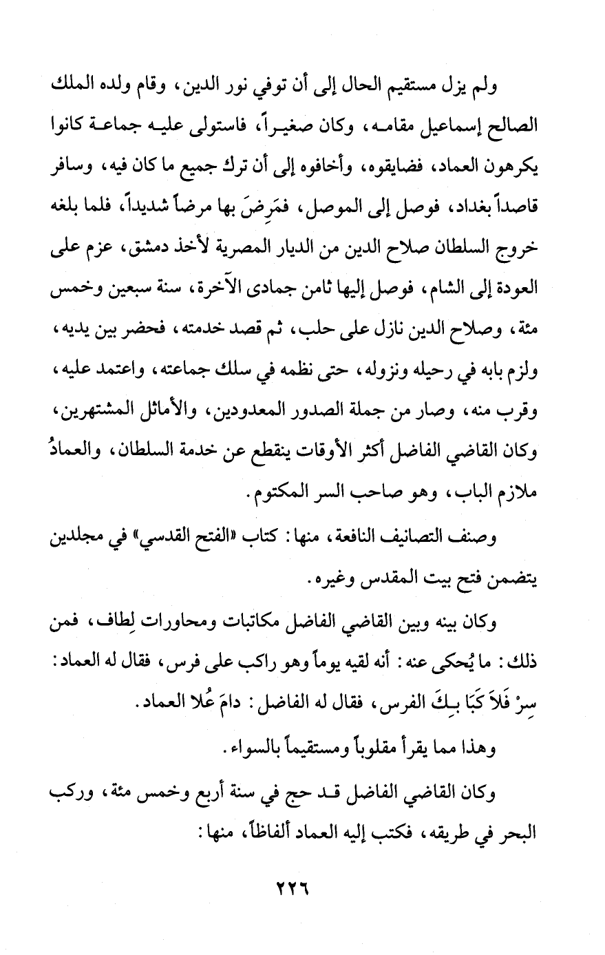 ولم يزل مستقيم الحال إلى أن توفي نور الدين، وقام ولده الملك الصالح إسماعيل مقامه، وكان صغيرًا، فاستولى عليه جماعة كانوا يكرهون العماد، فضايقوه، وأخافوه إلى أن ترك جميع ما كان فيه، وسافر قاصدًا بغداد، فوصل إلى الموصل، فمَرِضَ بها مرضًا شديدًا، فلما بلغه خروج السلطان صلاح الدين من الديار المصرية لأخذ دمشق، عزم على العودة إلى الشام، فوصل إليها ثامن جمادى الآخرة، سنة سبعين وخمس مئة، وصلاح الدين نازل على حلب، ثم قصد خدمته، فحضر بين يديه، ولزم بابه في رحيله ونزوله، حتى نظمه في سلك جماعته، واعتمد عليه، وقرب منه، وصار من جملة الصدور المعدودين، والأماثل المشتهرين، وكان القاضي الفاضل أكثر الأوقات ينقطع عن خدمة السلطان، والعمادُ ملازم الباب، وهو صاحب السر المكتوم.