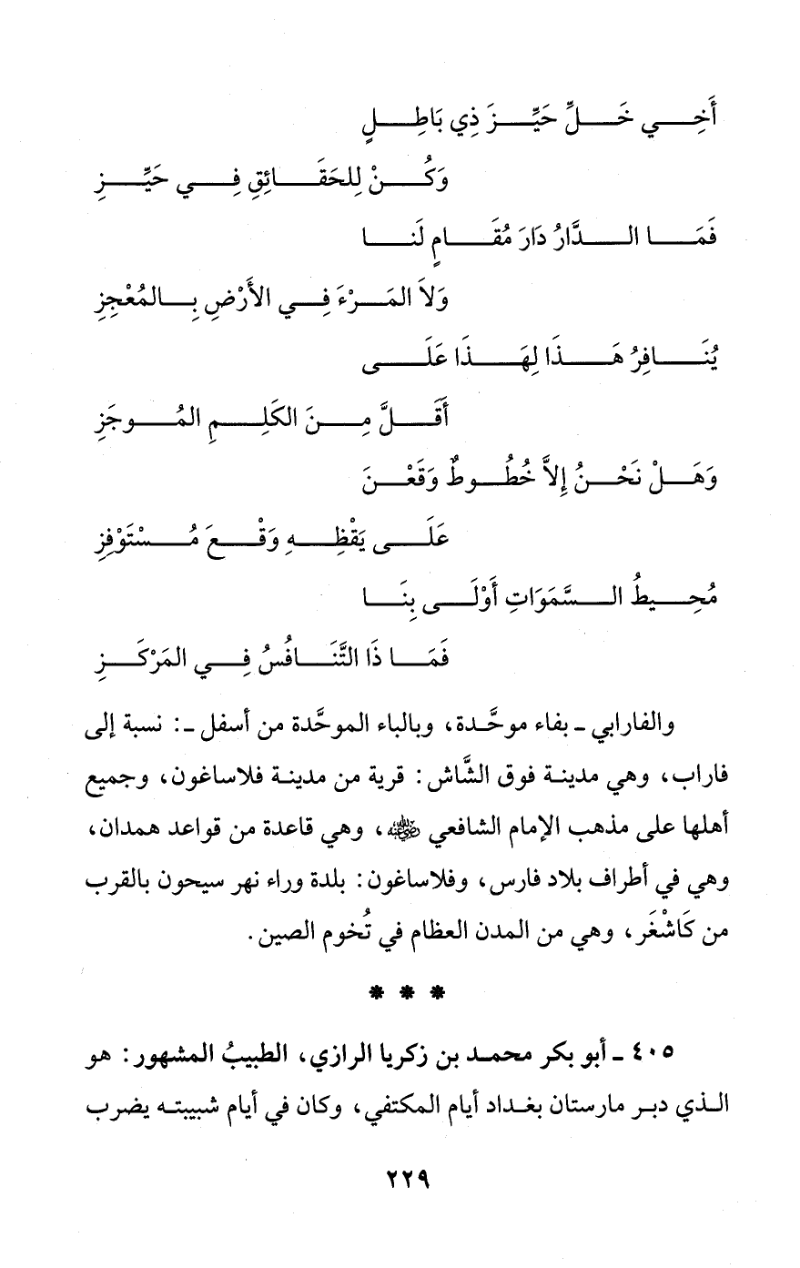 405 - أبو بكر محمد بن زكريا الرازي، الطبيبُ المشهور: هو الذي دبر مارستان بغداد أيام المكتفي، وكان في أيام شبيبته يضرب