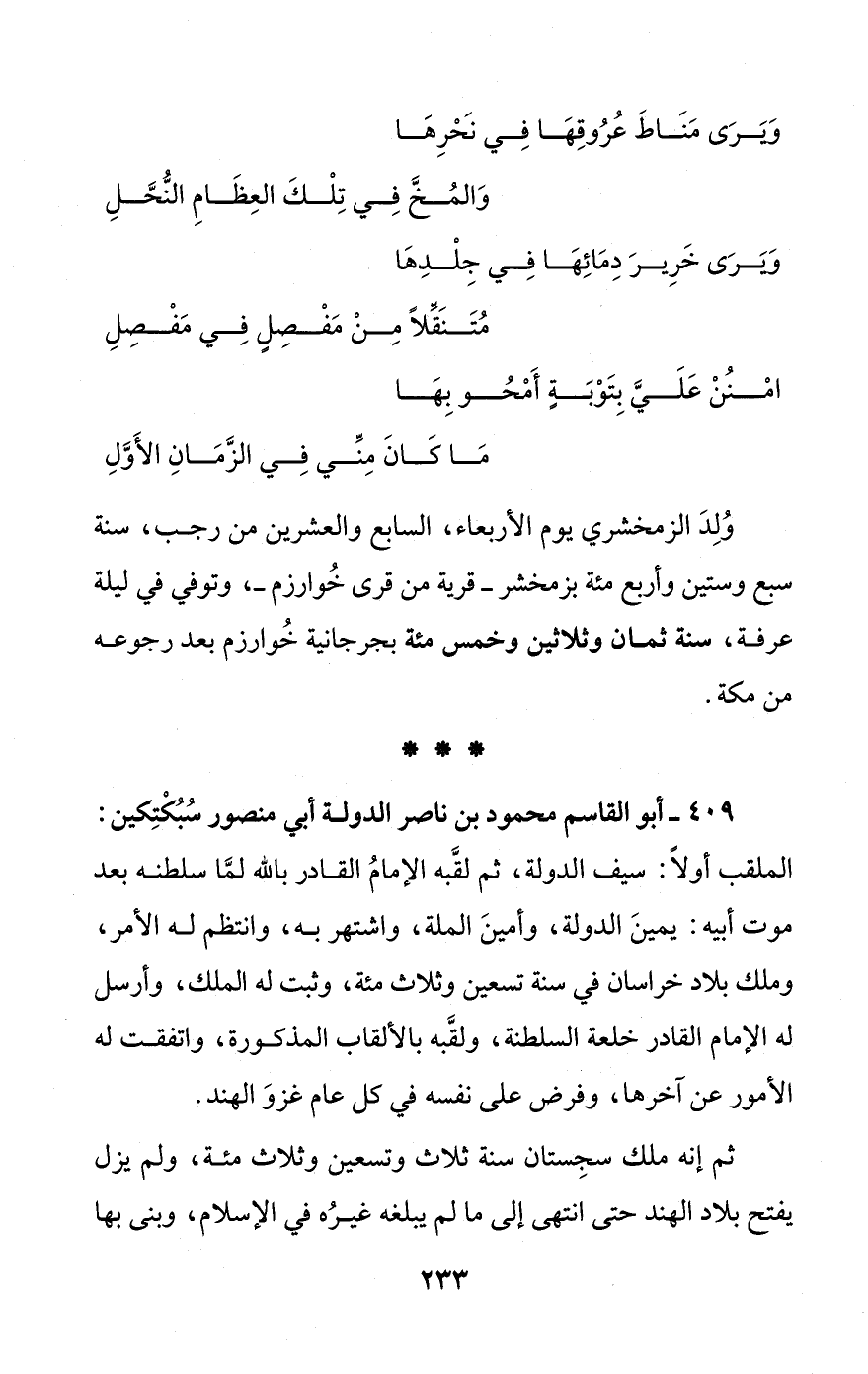 409 - أبو القاسم محمود بن ناصر الدولة أبي منصور سُبُكْتِكين: الملقب أولاً: سيف الدولة، ثم لقَّبه الإمامُ القادر بالله لمَّا سلطنه بعد موت أبيه: يمينَ الدولة، وأمينَ الملة، واشتهر به، وانتظم له الأمر، وملك بلاد خراسان في سنة تسعين وثلاث مئة، وثبت له الملك، وأرسل له الإمام القادر خلعة السلطنة، ولقَّبه بالألقاب المذكورة، واتفقت له الأمور عن آخرها، وفرض على نفسه في كل عام غزوَ الهند.