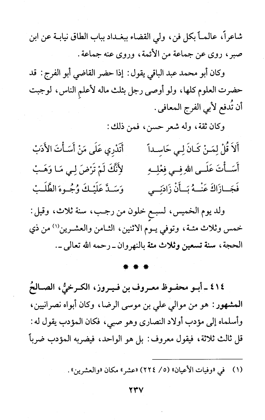 414 - أبو محفوظ معروف بن فيروز، الكرخيُّ، الصالحُ المشهور: هو من موالي علي بن موسى الرضا، وكان أبواه نصرانيين، وأسلماه إلى مؤدب أولاد النصارى وهو صبي، فكان المؤدب يقول له: قل ثالث ثلاثة، فيقول معروف: بل هو الواحد، فيضربه المؤدب ضرباً