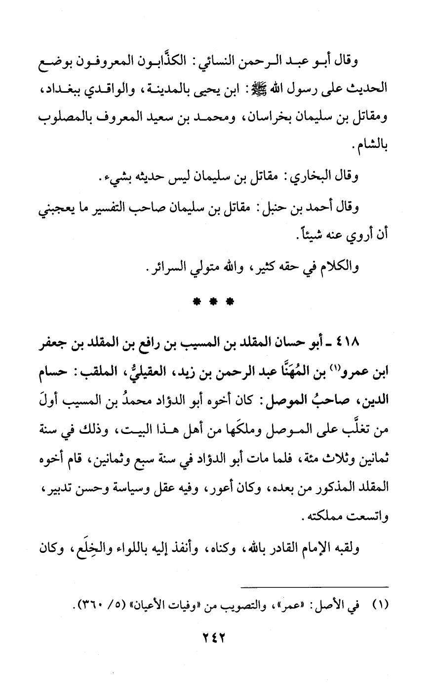 418 - أبو حسان المقلد بن المسيب بن رافع بن المقلد بن جعفر ابن عمرو (¬1) بن المُهَنَّا عبد الرحمن بن زيد، العقيليُّ، الملقب: حسام الدين، صاحبُ الموصل: كان أخوه أبو الدؤاد محمدُ بن المسيب أولَ من تغلَّب على الموصل وملكَها من أهل هذا البيت، وذلك في سنة ثمانين وثلاث مئة، فلما مات أبو الدؤاد في سنة سبع وثمانين، قام أخوه المقلد المذكور من بعده، وكان أعور، وفيه عقل وسياسة وحسن تدبير، واتسعت مملكته.