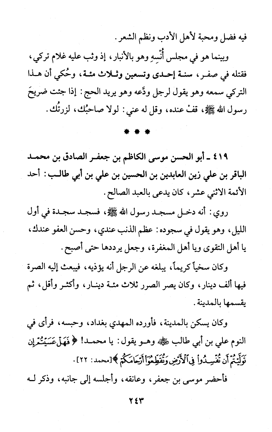 419 - أبو الحسن موسى الكاظم بن جعفر الصادق بن محمد الباقر بن علي زين العابدين بن الحسين بن علي بن أبي طالب: أحد الأئمة الاثني عشر، كان يدعى بالعبد الصالح.