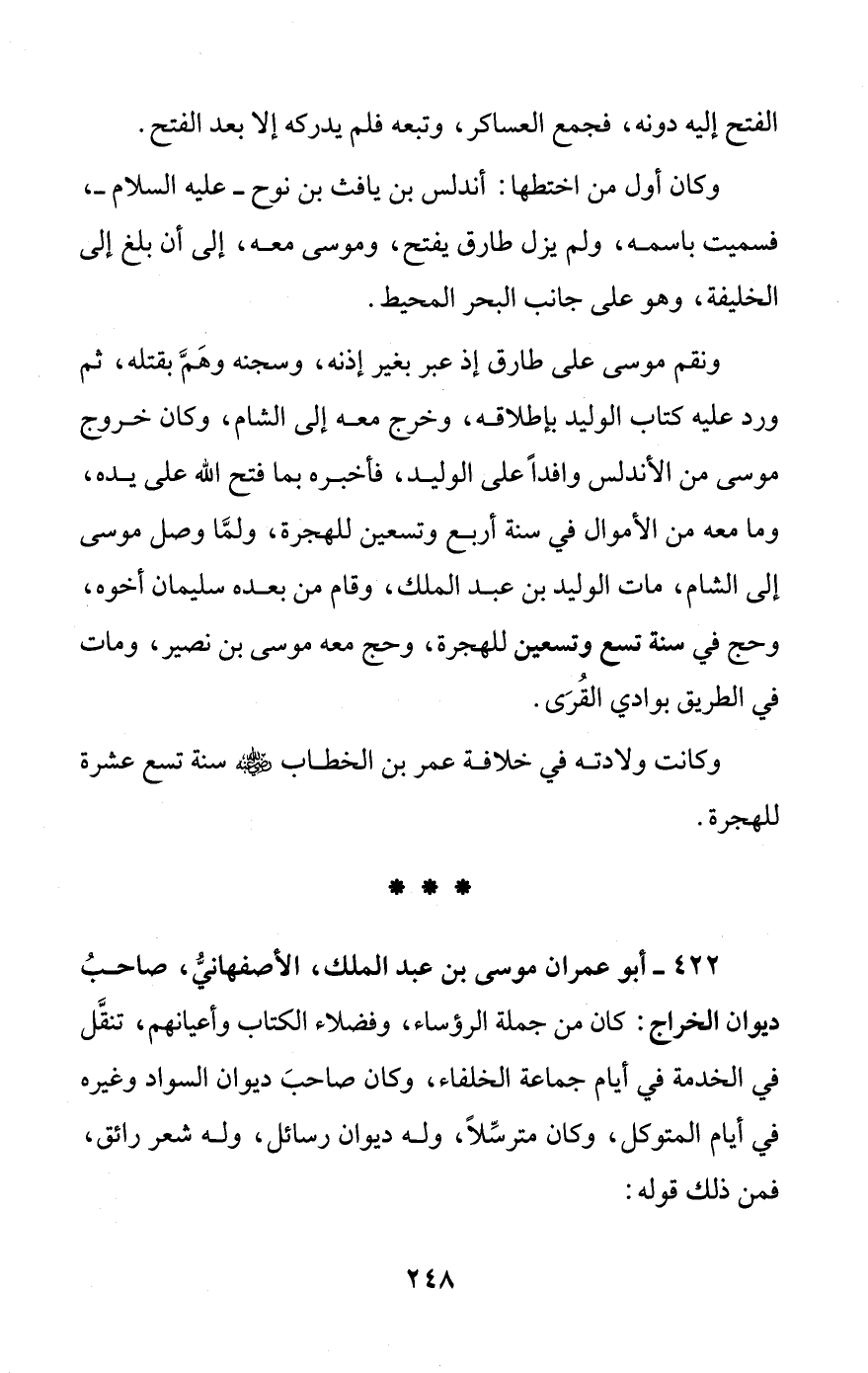 422 - أبو عمران موسى بن عبد الملك، الأصفهانيُّ، صاحبُ ديوان الخراج: كان من جملة الرؤساء، وفضلاء الكتاب وأعيانهم، تنقَّل في الخدمة في أيام جماعة الخلفاء، وكان صاحبَ ديوان السواد وغيره في أيام المتوكل، وكان مترسِّلاً، وله ديوان رسائل، وله شعر رائق، فمن ذلك قوله: