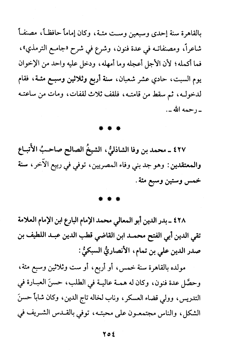 427 - محمد بن وفا الشاذليُّ، الشيخُ الصالح صاحبُ الأَتباع والمعتقدين: وهو جد بني وفاء المصريين، توفي في ربيع الآخر، سنة خمس وستين وسبع مئة.