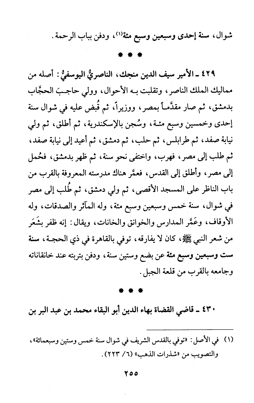 429 - الأمير سيف الدين منجك، الناصريُّ اليوسفيُّ: أصله من مماليك الملك الناصر، وتقلبت به الأحوال، وولي حاجبَ الحجَّاب بدمشق، ثم صار مقدَّمًا بمصر، ووزيراً، ثم قُبض عليه في شوال سنة إحدى وخمسين وسبع مئة، وسُجن بالإسكندرية، ثم أطلق، ثم ولي نيابة صفد، ثم طرابلس، ثم حلب، ثم دمشق، ثم أعيد إلى نيابة صفد، ثم طلب إلى مصر، فهرب، واختفى نحو سنة، ثم ظهر بدمشق، فحُمل إلى مصر، وأطلق إلى القدس، فعمَّر هناك مدرسته المعروفة بالقرب من باب الناظر على المسجد الأقصى، ثم ولي دمشق، ثم طُلب إلى مصر في شوال، سنة خمس وسبعين وسبع مئة، وله المآثر والصدقات، وله الأوقاف، وعَمَّر المدارس والخوانق والخانات، ويقال: إنه ظفر بشَعَر من شعر النبي - صلى الله عليه وسلم -، كان لا يفارقه، توفي بالقاهرة في ذي الحجة، سنة ست وسبعين وبسبع مئة عن بضع وستين سنة، ودفن بتربته عند خانقاناته وجامعه بالقرب من قلعة الجبل.