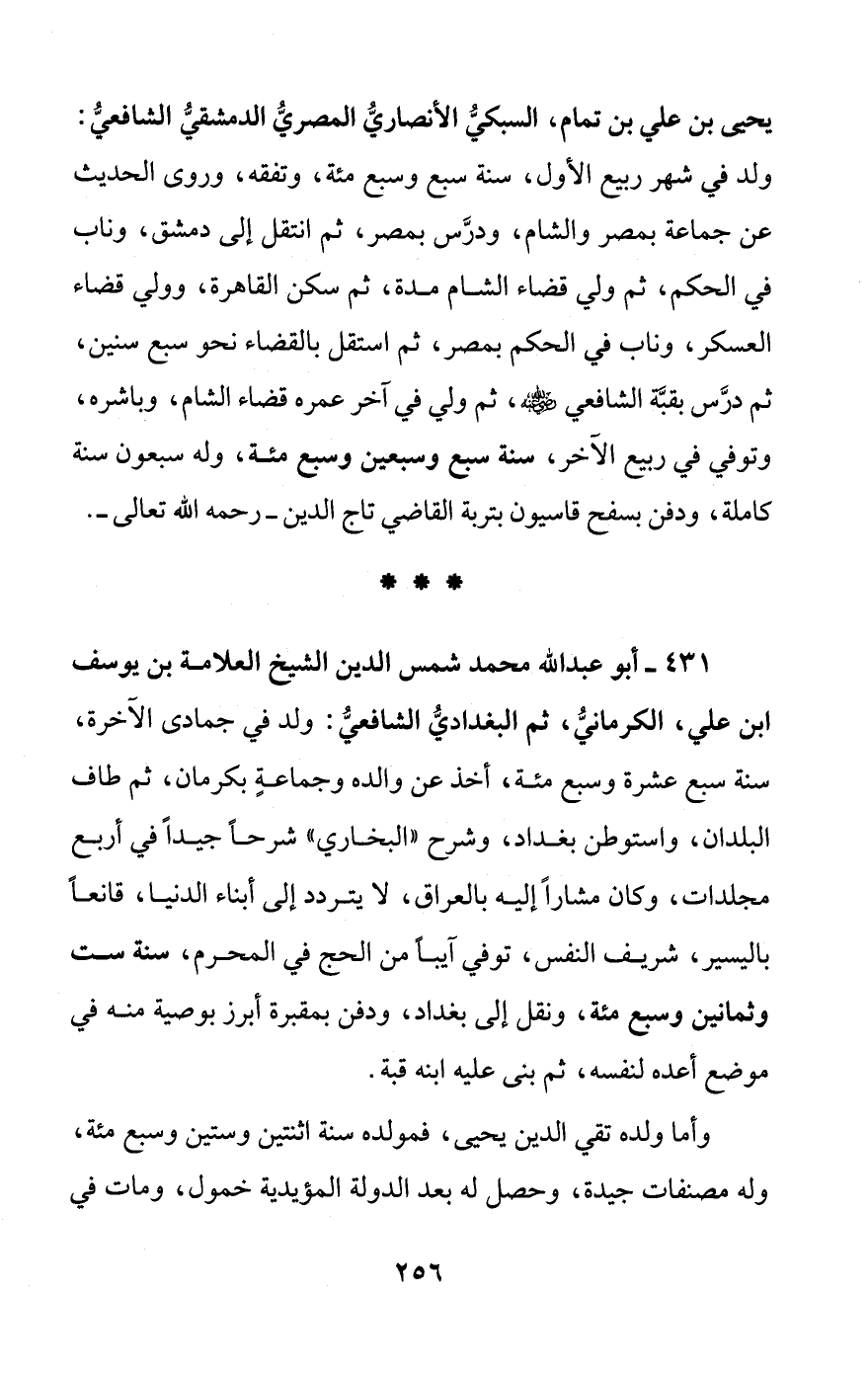 431 - أبو عبد الله محمد شمس الدين الشيخ العلامة بن يوسف ابن علي، الكرمانيُّ، ثم البغداديُّ الشافعيُّ: ولد في جمادى الآخرة، سنة سبع عشرة وسبع مئة، أخذ عن والده وجماعةٍ بكرمان، ثم طاف البلدان، واستوطن بغداد، وشرح "البخاري" شرحاً جيداً في أربع مجلدات، وكان مشاراً إليه بالعراق، لا يتردد إلى أبناء الدنيا، قانعاً باليسير، شريف النفس، توفي آيبًا من الحج في المحرم، سنة ست وثمانين وسبع مئة، ونقل إلى بغداد، ودفن بمقبرة أبرز بوصية منه في موضع أعده لنفسه، ثم بنى عليه ابنه قبة.