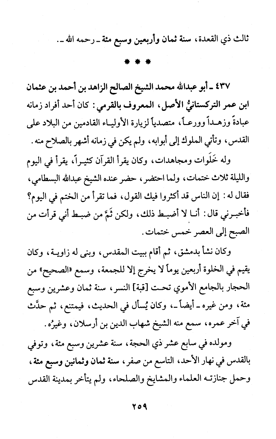 437 - أبو عبد الله محمد الشيخ الصالح الزاهد بن أحمد بن عثمان ابن عمر التركستانيُّ الأصل، المعروف بالقرمي: كان أحد أفراد زمانه عبادةً وزهدًا وورعًا، متصديًا لزيارة الأولياء القادمين من البلاد على القدس، وتأتي الملوك إلى أبوابه، ولم يكن في زمانه أشهر بالصلاح منه.