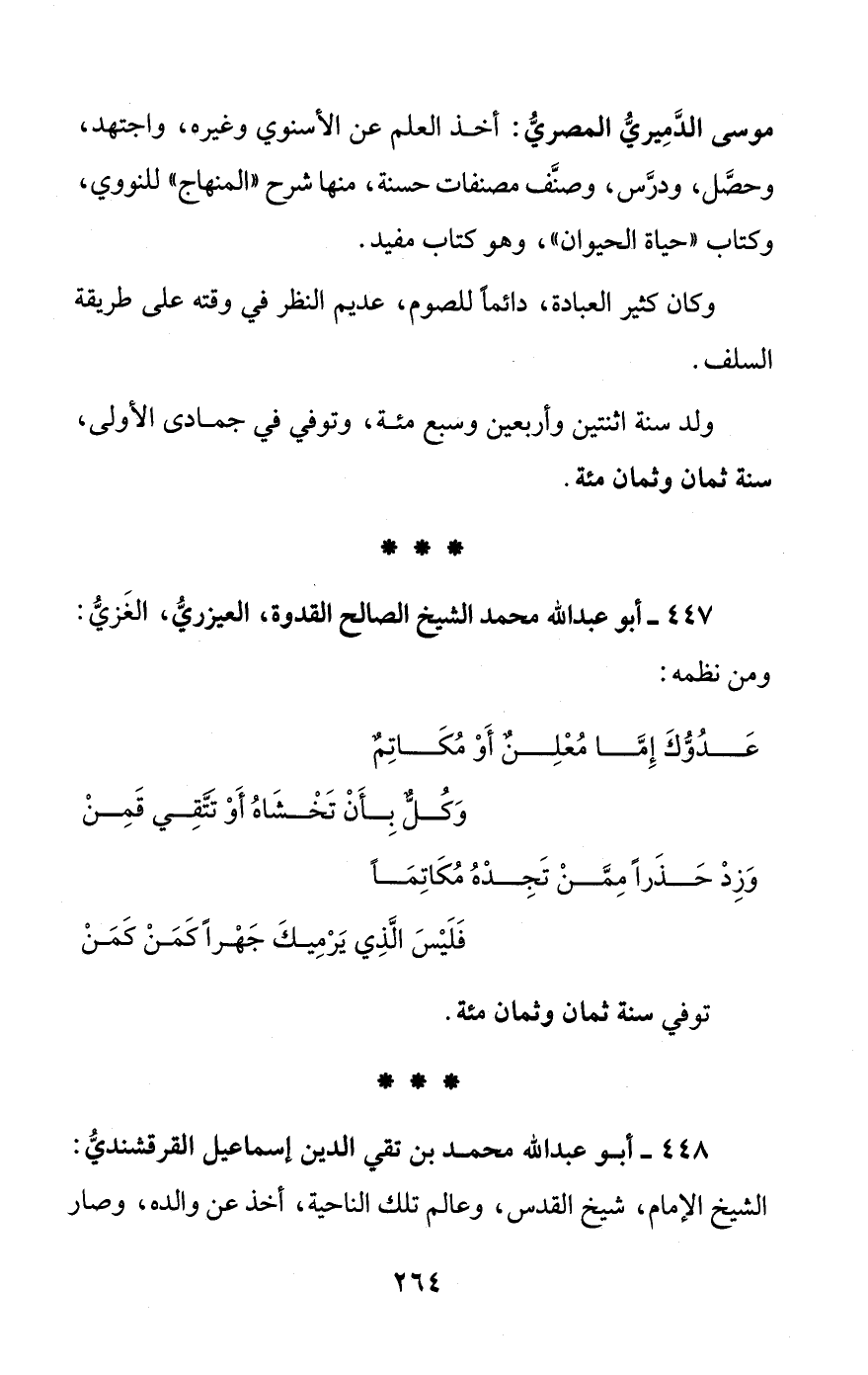موسى الدَّمِيريُّ المصريُّ: أخذ العلم عن الأسنوي وغيره، واجتهد، وحصَّل، ودرَّس، وصنَّف مصنفات حسنة، منها شرح "المنهاج" للنووي، وكتاب "حياة الحيوان"، وهو كتاب مفيد.