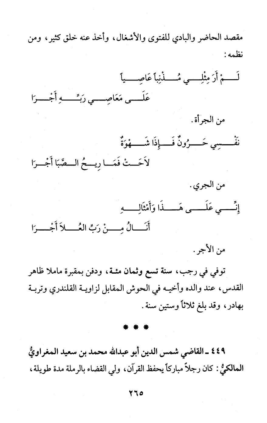 449 - القاضي شمس الدين أبو عبد الله محمد بن سعيد المغراويُّ المالكىُّ: كان رجلاً مباركاً يحفظ القرآن، ولي القضاء بالرملة مدة طويلة،