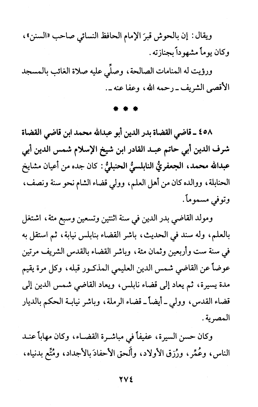 458 - قاضي القضاة بدر الدين أبو عبد الله محمد ابن قاضي القضاة شرف الدين أبي حاتم عبد القادر ابن شيخ الإسلام شمس الدين أبي عبد الله محمد، الجعفريُّ النابلسيُّ الحنبليُّ: كان جده من أعيان مشايخ الحنابلة، ووالده كان من أهل العلم، وولي قضاء الشام نحو سنة ونصف، وتوفي مسموماً.
