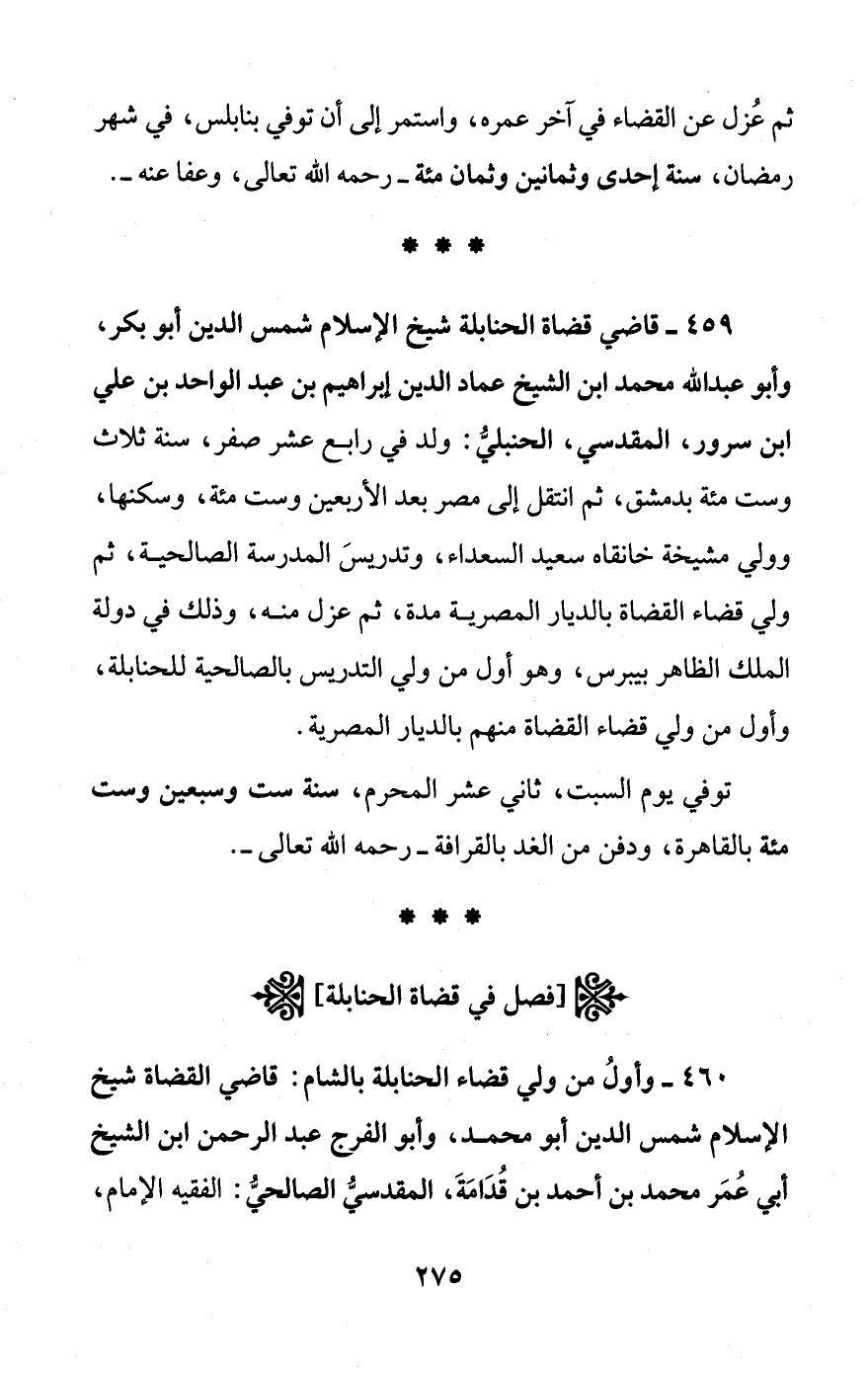 460 - وأولُ من ولي قضاء الحنابلة بالشام: قاضي القضاة شيخ الإسلام شمس الدين أبو محمد، وأبو الفرج عبد الرحمن ابن الشيخ أبي عُمَر محمد بن أحمد بن قُدَامَةَ، المقدسيُّ الصالحيُّ: الفقيه الإمام،