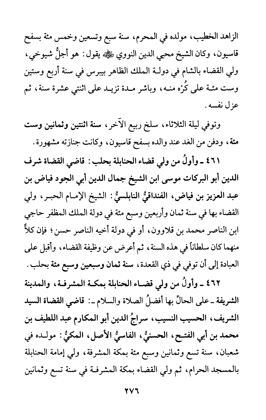 461 - وأولُ من ولي قضاء الحنابلة بحلب: قاضي القضاة شرف الدين أبو البركات موسى ابن الشيخ جمال الدين أبي الجود فياض بن عبد العزيز بن فياض، الفنداقيُّ النابلسيُّ: الشيخ الإمام الحبر، ولي القضاء بها في سنة ثمان وأربعين وسبع مئة في دولة الملك المظفر حاجي ابن الناصر محمد بن قلاوون، أو في دولة أخيه الناصر حسن؛ فإن كلًّا منهما كان سلطاناً في هذه السنة، ثم أعرض عن وظيفة القضاء، وأقبل على العبادة إلى أن توفي في ذي القعدة، سنة ثمان وسبعين وسبع مئة بحلب.