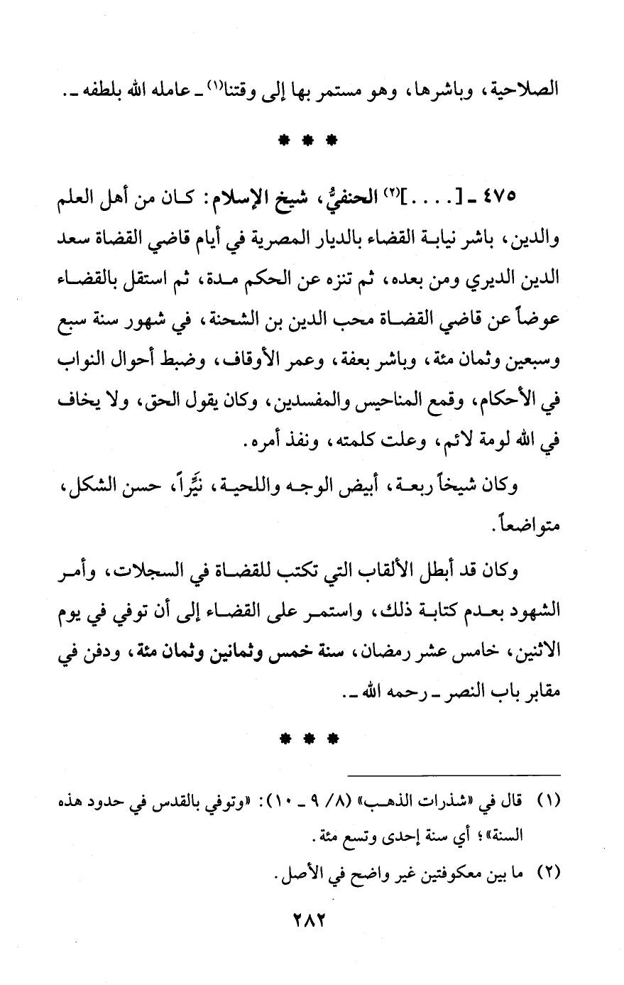 475 - [ ... ] (¬2) الحنفيُّ، شيخ الإسلام: كان من أهل العلم والدين، باشر نيابة القضاء بالديار المصرية في أيام قاضي القضاة سعد الدين الديري ومن بعده، ثم تنزه عن الحكم مدة، ثم استقل بالقضاء عوضاً عن قاضي القضاة محب الدين بن الشحنة، في شهور سنة سبع وسبعين وثمان مئة، وباشر بعفة، وعمر الأوقاف، وضبط أحوال النواب في الأحكام، وقمع المناحيس والمفسدين، وكان يقول الحق، ولا يخاف في الله لومة لائم، وعلت كلمته، ونفذ أمره.