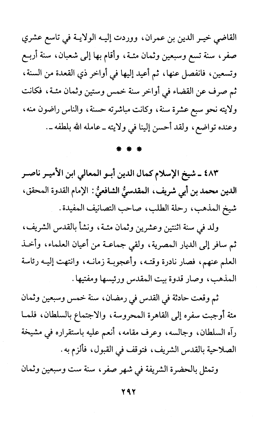 483 - شيخ الإسلام كمال الدين أبو المعالي ابن الأمير ناصر الدين محمد بن أبي شريف، المقدسيُّ الشافعيُّ: الإمام القدوة المحقق، شيخ المذهب، رحلة الطلب، صاحب التصانيف المفيدة.