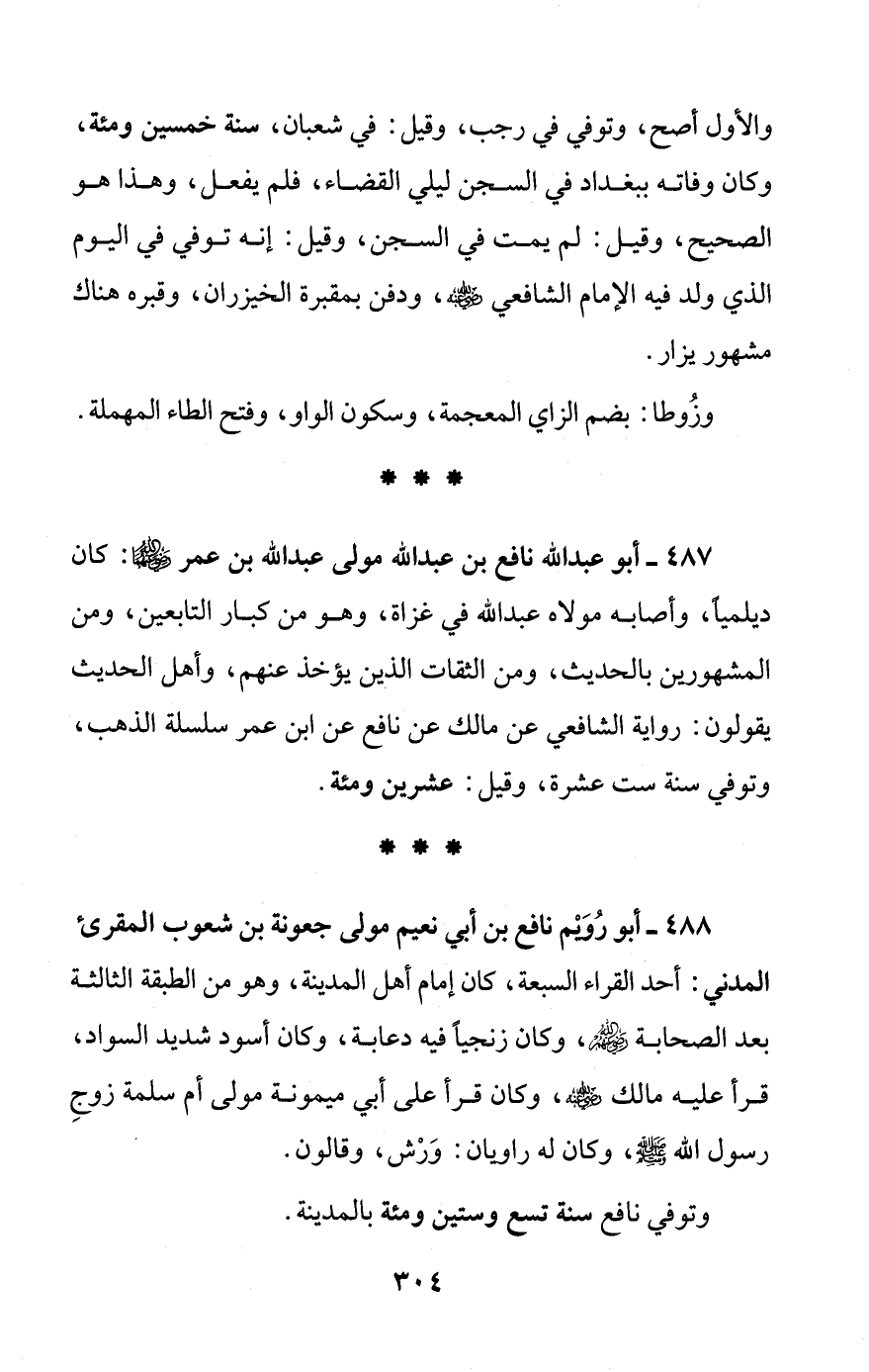 487 - أبو عبد الله نافع بن عبد الله مولى عبد الله بن عمر - رضي الله عنهما -: كان ديلمياً، وأصابه مولاه عبد الله في غزاة، وهو من كبار التابعين، ومن المشهورين بالحديث، ومن الثقات الذين يؤخذ عنهم، وأهل الحديث يقولون: رواية الشافعي عن مالك عن نافع عن ابن عمر سلسلة الذهب، وتوفي سنة ست عشرة، وقيل: عشرين ومئة.