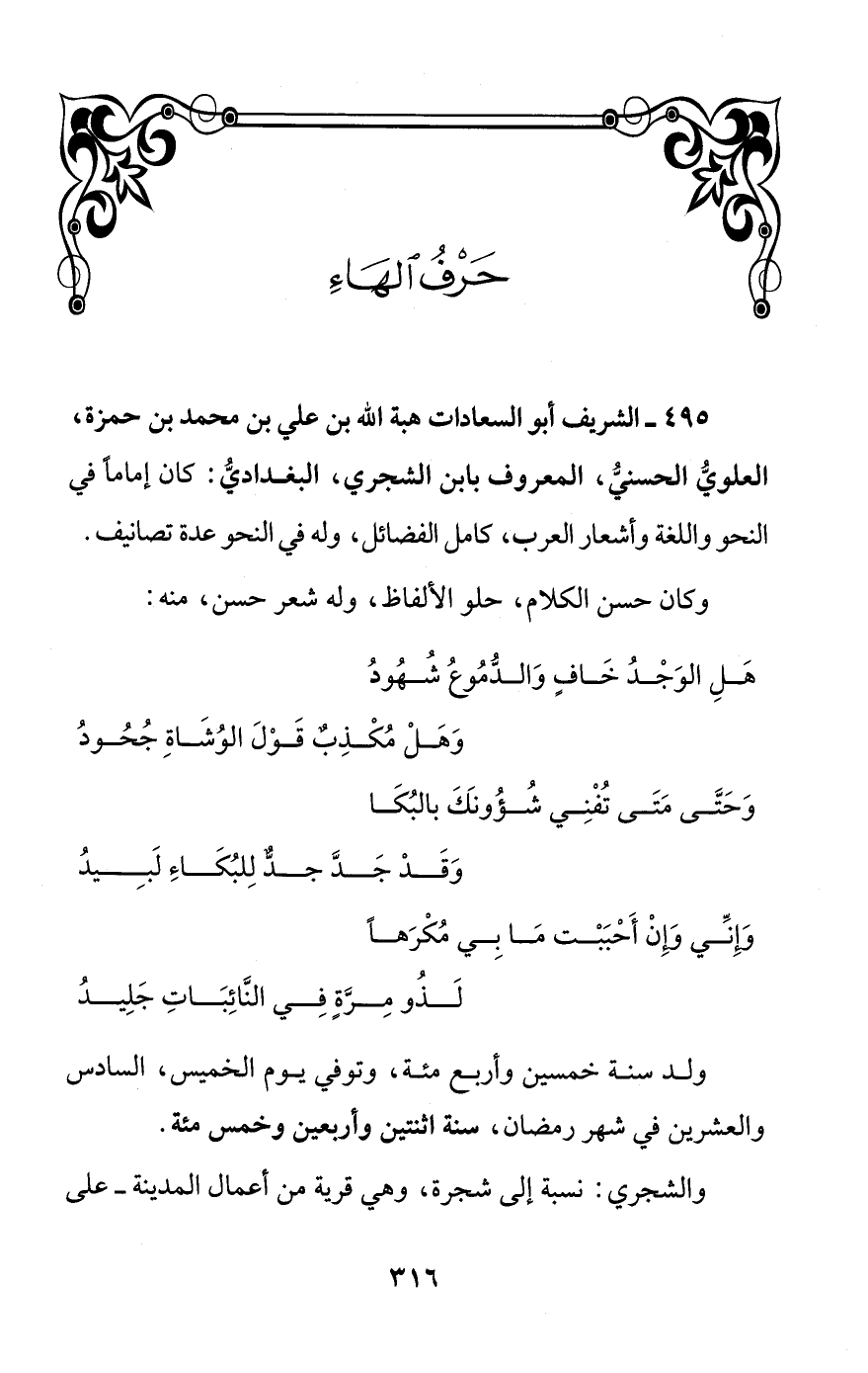 495 - الشريف أبو السعادات هبة الله بن علي بن محمد بن حمزة، العلويُّ الحسنيُّ، المعروف بابن الشجري، البغداديُّ: كان إمامًا في النحو واللغة وأشعار العرب، كامل الفضائل، وله في النحو عدة تصانيف.