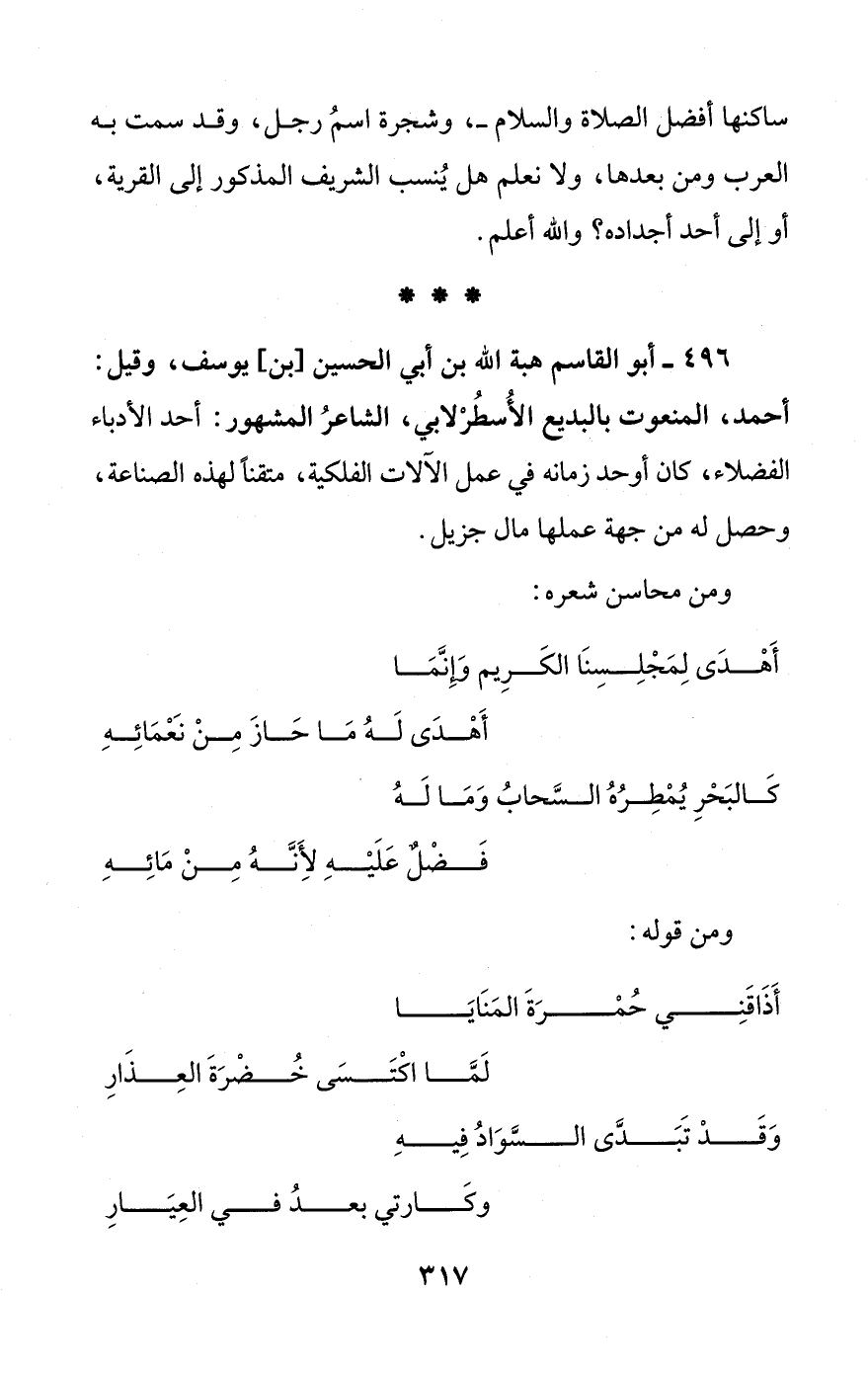 496 - أبو القاسم هبة الله بن أبي الحسين [بن] يوسف، وقيل: أحمد، المنعوت بالبديع الأُسطُرْلابي، الشاعرُ المشهور: أحد الأدباء الفضلاء، كان أوحد زمانه في عمل الآلات الفلكية، متقناً لهذه الصناعة، وحصل له من جهة عملها مال جزيل.