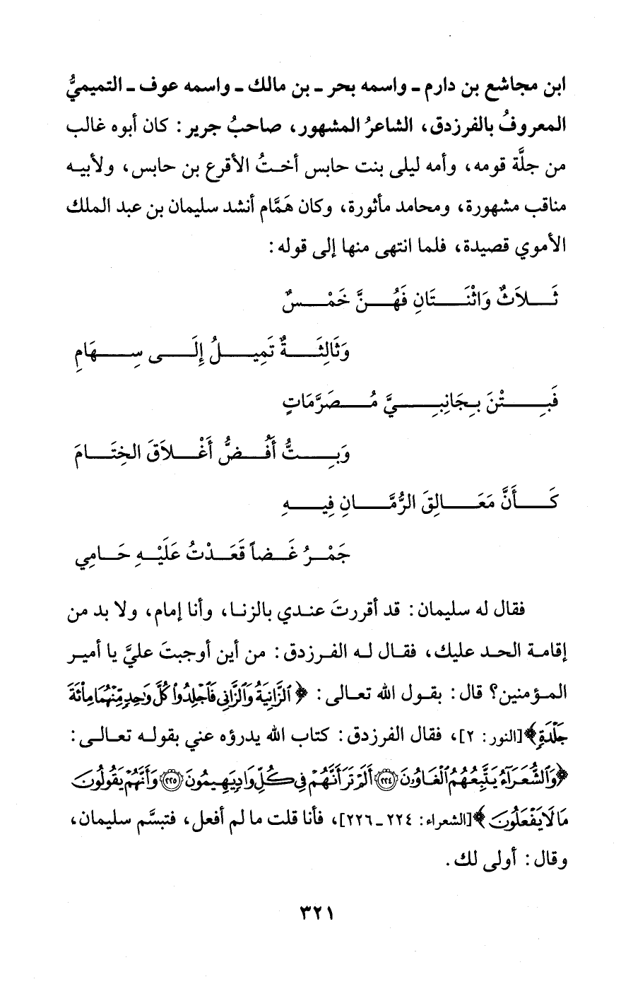 فقال له سليمان: قد أقررتَ عندي بالزنا، وأنا إمام، ولا بد من إقامة الحد عليك، فقال له الفرزدق: من أين أوجبتَ عليَّ يا أمير المؤمنين؟ قال: بقول الله تعالى: {الزَّانِيَةُ وَالزَّانِي فَاجْلِدُوا كُلَّ وَاحِدٍ مِنْهُمَا مِائَةَ جَلْدَةٍ} [النور: 2]، فقال الفرزدق: كتاب الله يدرؤه عني بقوله تعالى: {وَالشُّعَرَاءُ يَتَّبِعُهُمُ الْغَاوُونَ (224) أَلَمْ تَرَ أَنَّهُمْ فِي كُلِّ وَادٍ يَهِيمُونَ (225) وَأَنَّهُمْ يَقُولُونَ مَا لَا يَفْعَلُونَ} [الشعراء: 224 - 226]، فانا قلت ما لم أفعل، فتبسَّم سليمان، وقال: أولى لك.