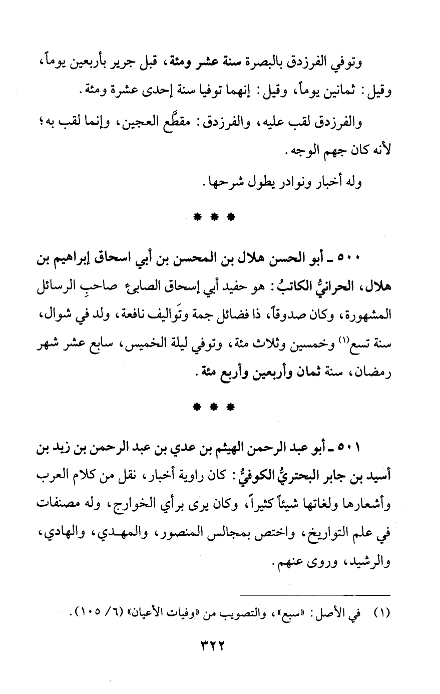 501 - أبو عبد الرحمن الهيثم بن عدي بن عبد الرحمن بن زيد بن أسيد بن جابر البحتريُّ الكوفيُّ: كان راوية أخبار، نقل من كلام العرب وأشعارها ولغاتها شيئاً كثيراً، وكان يرى برأي الخوارج، وله مصنفات في علم التواريخ، واختص بمجالس المنصور، والمهدي، والهادي، والرشيد، وروى عنهم.
