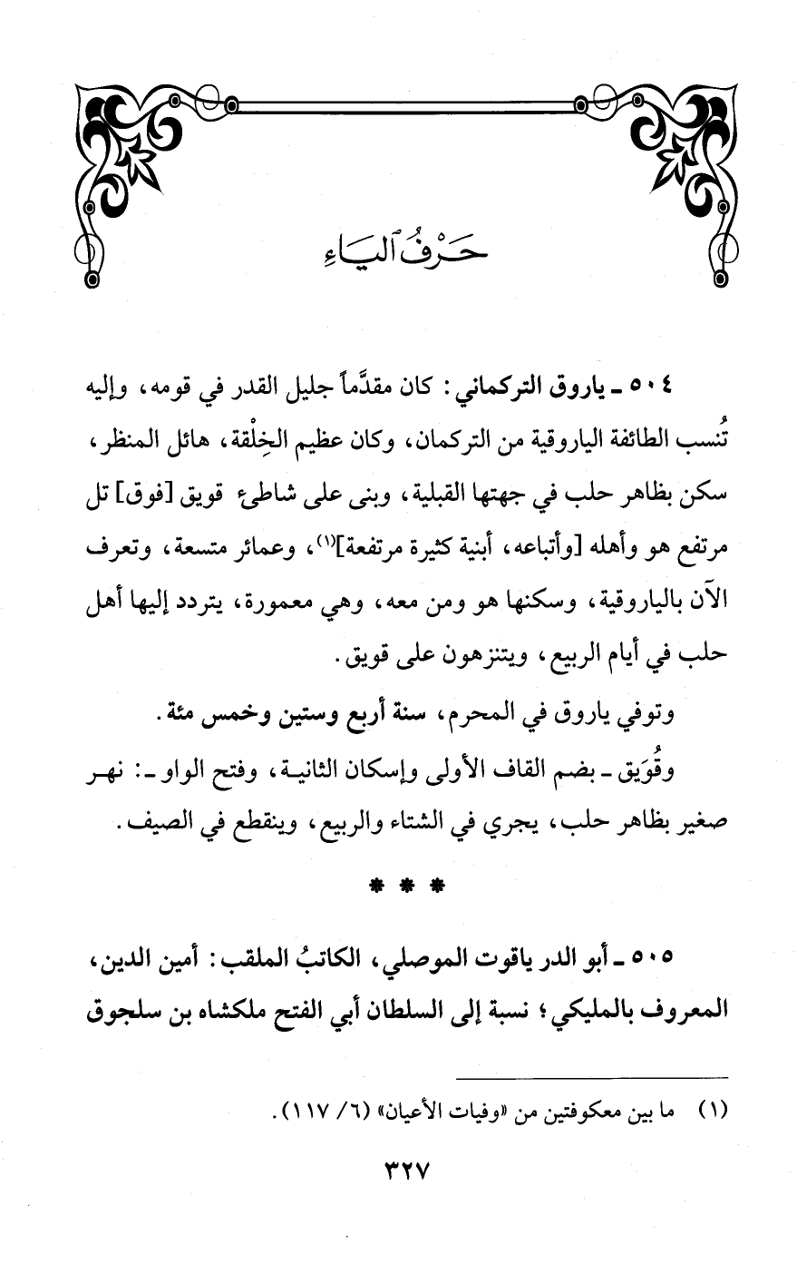 504 - ياروق التركماني: كان مقدَّمًا جليل القدر في قومه، وإليه تُنسب الطائفة الياروقية من التركمان، وكان عظيم الخِلْقة، هائل المنظر، سكن بظاهر حلب في جهتها القبلية، وبنى على شاطئ قويق [فوق] تل مرتفع هو وأهله [وأتباعه، أبنية كثيرة مرتفعة] (¬1)، وعمائر متسعة، وتعرف الآن بالياروقية، وسكنها هو ومن معه، وهي معمورة، يتردد إليها أهل حلب في أيام الربيع، ويتنزهون على قويق.