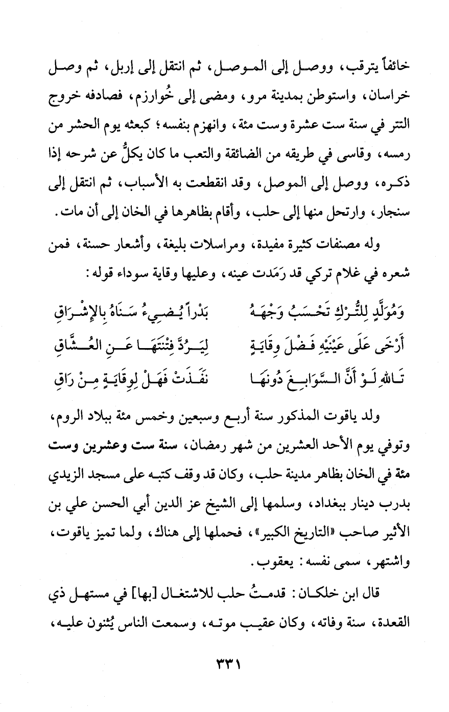 خائفًا يترقب، ووصل إلى الموصل، ثم انتقل إلى إربل، ثم وصل خراسان، واستوطن بمدينة مرو، ومضى إلى خُوارزم، فصادفه خروج التتر في سنة لست عشرة ولست مئة، وانهزم بنفسه، كبعثه يوم الحشر من رمسه، وقاسى في طريقه من الضائقة والتعب ما كان يكلُّ عن شرحه إذا ذكره، ووصل إلى الموصل، وقد انقطعت به الأسباب، ثم انتقل إلى سنجار، وارتحل منها إلى حلب، وأقام بظاهرها في الخان إلى أن مات.