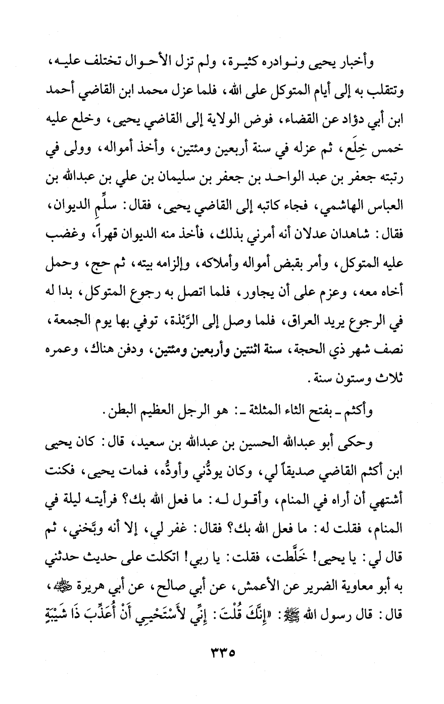 وحكى أبو عبد الله الحسين بن عبد الله بن سعيد، قال: كان يحيى ابن أكثم القاضي صديقًا لي، وكان يودُّني وأودُّه، فمات يحيى، فكنت أشتهي أن أراه في المنام، وأقول له: ما فعل الله بك؟ فرأيته ليلة في المنام، فقلت له: ما فعل الله بك؟ فقال: غفر لي، إلا أنه وبَّخني، ثم قال لي: يا يحيى! خَلَّطت، فقلت: يا ربي! اتكلت على حديث حدثني به أبو معاوية الضرير عن الأعمش، عن أبي صالح، عن أبي هريرة - رضي الله عنه -، قال: قال رسول الله - صلى الله عليه وسلم -: "إِنَّكَ قُلْتَ: إِنِّي لأَسْتَحْيِي أَنْ أُعَذِّبَ ذَا شَيْبَةٍ