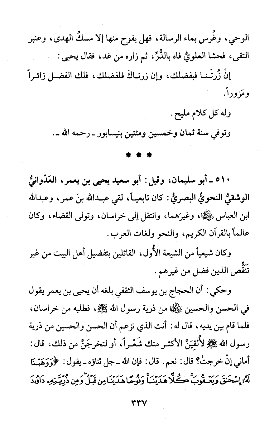 510 - أبو سليمان، وقيل: أبو سعيد يحيى بن يعمر، العَدْوانيُّ الوشقيُّ النحويُّ البصريُّ: كان تابعيًا، لقي عبد الله بنَ عمر، وعبد الله ابن العباس - رضي الله عنهما -، وغيرَهما، وانتقل إلى خراسان، وتولى القضاء، وكان عالمًا بالقرآن الكريم، والنحو ولغات العرب.