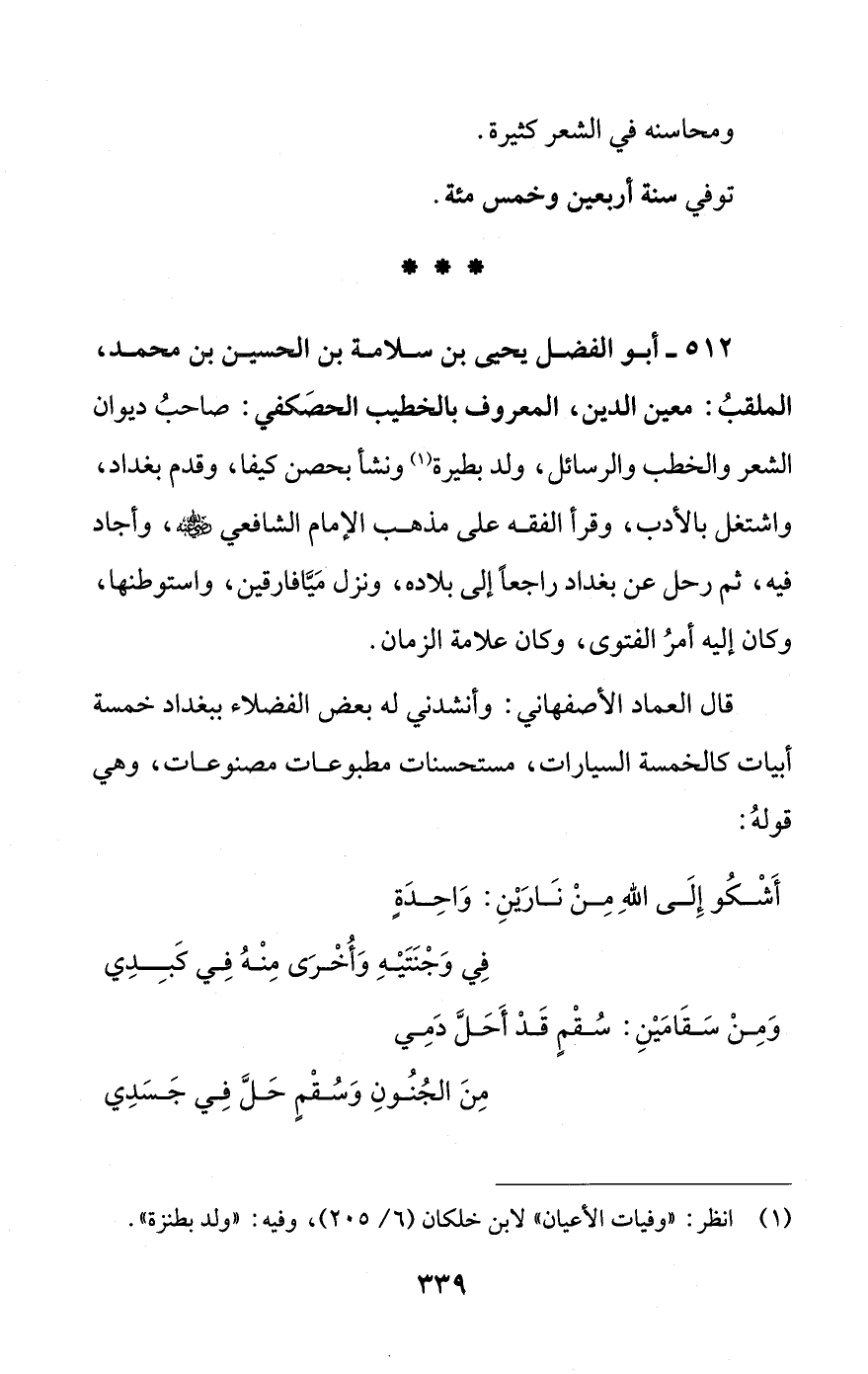 512 - أبو الفضل يحيى بن سلامة بن الحسين بن محمد، الملقبُ: معين الدين، المعروف بالخطيب الحصَكفي: صاحبُ ديوان الشعر والخطب والرسائل، ولد بطيرة (¬1) ونشأ بحصن كيفا، وقدم بغداد، واشتغل بالأدب، وقرأ الفقه على مذهب الإمام الشافعي - رضي الله عنه -، وأجاد فيه، ثم رحل عن بغداد راجعاً إلى بلاده، ونزل مَيَّافارقين، واستوطنها، وكان إليه أمرُ الفتوى، وكان علامة الزمان.