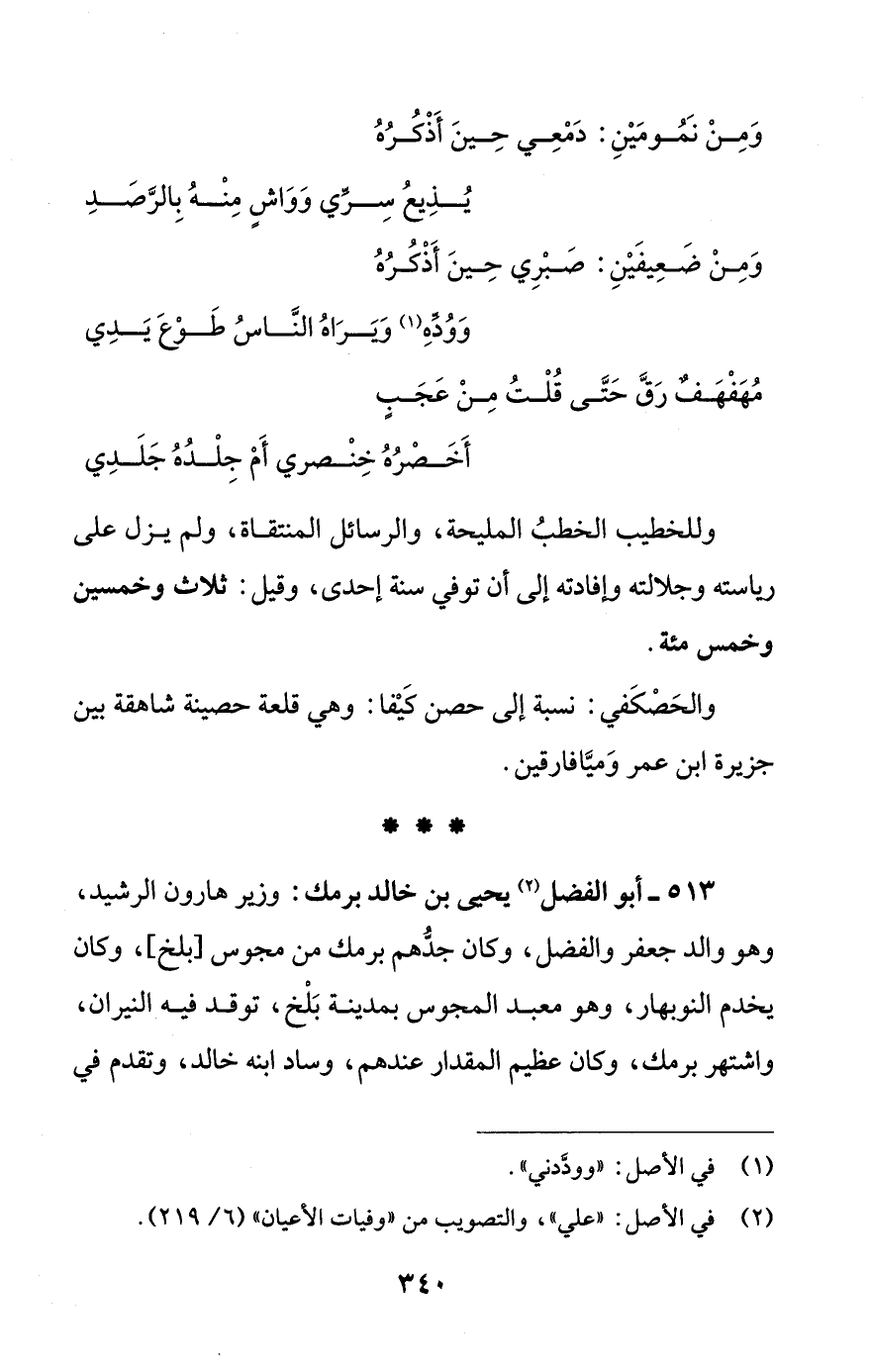 513 - أبو الفضل (¬2) يحيى بن خالد برمك: وزير هارون الرشيد، وهو والد جعفر والفضل، وكان جدُّهم برمك من مجوس [بلخ]، وكان يخدم النوبهار، وهو معبد المجوس بمدينة بَلْخ، توقد فيه النيران، واشتهر برمك، وكان عظيم المقدار عندهم، وساد ابنه خالد، وتقدم في