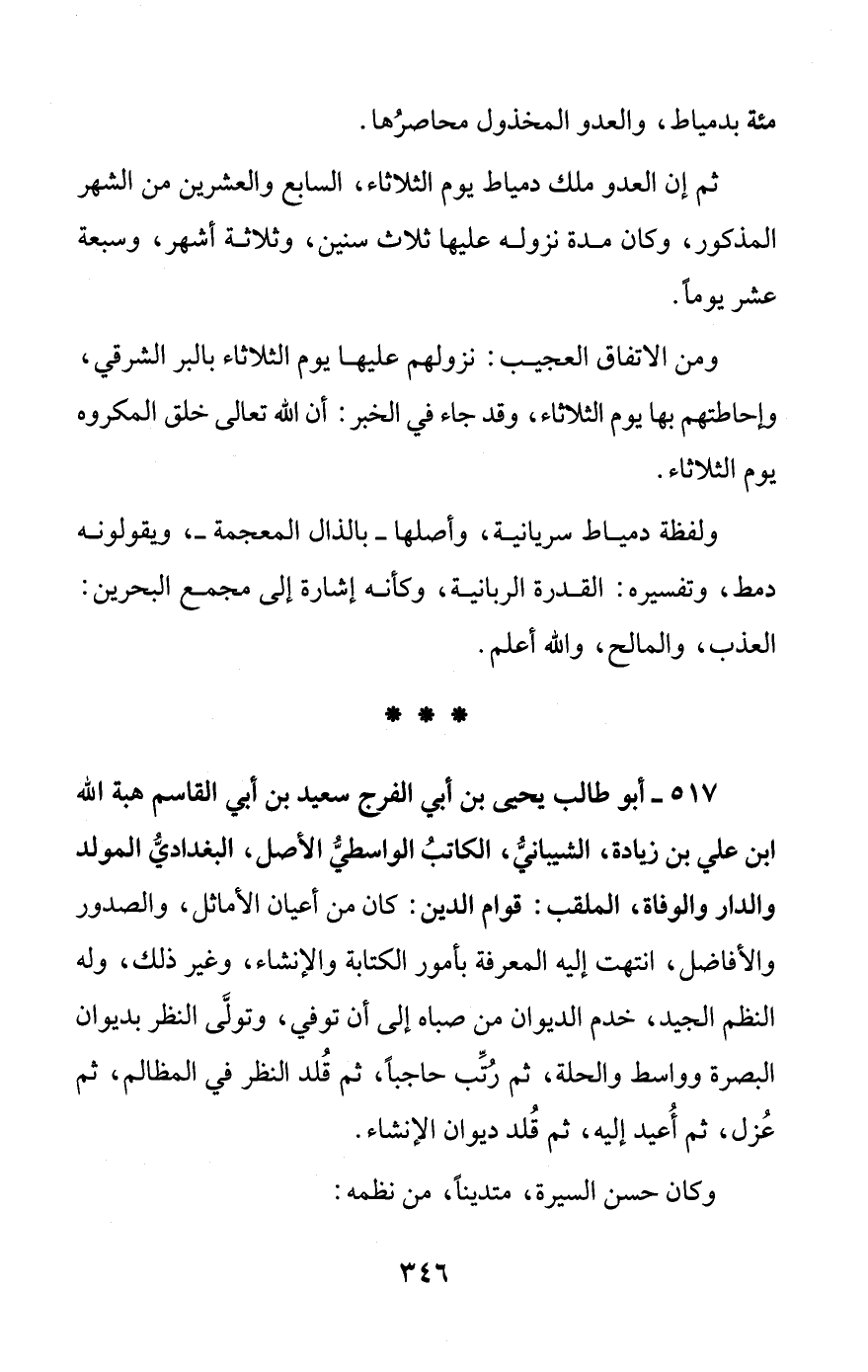 517 - أبو طالب يحيى بن أبي الفرج سعيد بن أبي القاسم هبة الله ابن علي بن زيادة، الشيبانيُّ، الكاتبُ الواسطيُّ الأصل، البغداديُّ المولد والدار والوفاة، الملقب: قوام الدين: كان من أعيان الأماثل، والصدور والأفاضل، انتهت إليه المعرفة بأمور الكتابة والإنشاء، وغير ذلك، وله النظم الجيد، خدم الديوان من صباه إلى أن توفي، وتولَّى النظر بديوان البصرة وواسط والحلة، ثم رُتِّب حاجباً، ثم قُلد النظر في المظالم، ثم عُزل، ثم أُعيد إليه، ثم قُلد ديوان الإنشاء.