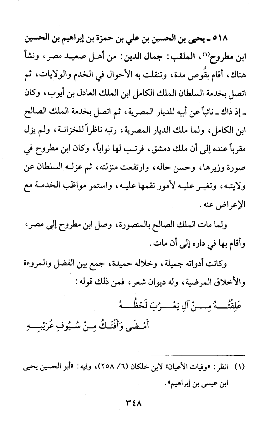 518 - يحيى بن الحسين بن علي بن حمزة بن إبراهيم بن الحسين ابن مطروح (¬1)، الملقب: جمال الدين: من أهل صعيد مصر، ونشأ هناك، أقام بقُوص مدة، وتنقلت به الأحوال في الخدم والولايات، ثم اتصل بخدمة السلطان الملك الكامل ابن الملك العادل بن أيوب، وكان - إذ ذاك - نائباً عن أبيه للديار المصرية، ثم اتصل بخدمة الملك الصالح ابن الكامل، ولما ملك الديار المصرية، رتبه ناظراً للخزانة، ولم يزل مقربا عنده إلى أن ملك دمشق، فرتب لها نوابا، وكان ابن مطروح في صورة وزيرها، وحسن حاله، وارتفعت منزلته، ثم عزله السلطان عن ولايته، وتغير عليه لأمور نقمها عليه، واستمر مواظب الخدمة مع الإعراض عنه.