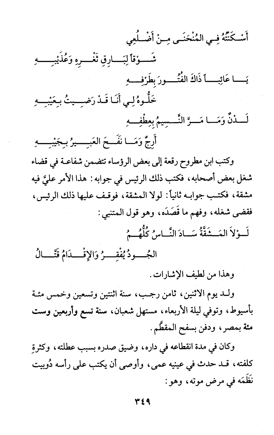 وكتب ابن مطروح رقعة إلى بعض الرؤساء تتضمن شفاعة في قضاء شغل بعض أصحابه، فكتب ذلك الرئيس في جوابه: هذا الأمر عليَّ فيه مشقة، فكتب جوابه ثانيًا: لولا المشقة، فوقف عليها ذلك الرئيس، فقضى شغله، وفهم ما قَصَدَه، وهو قول المتنبي: