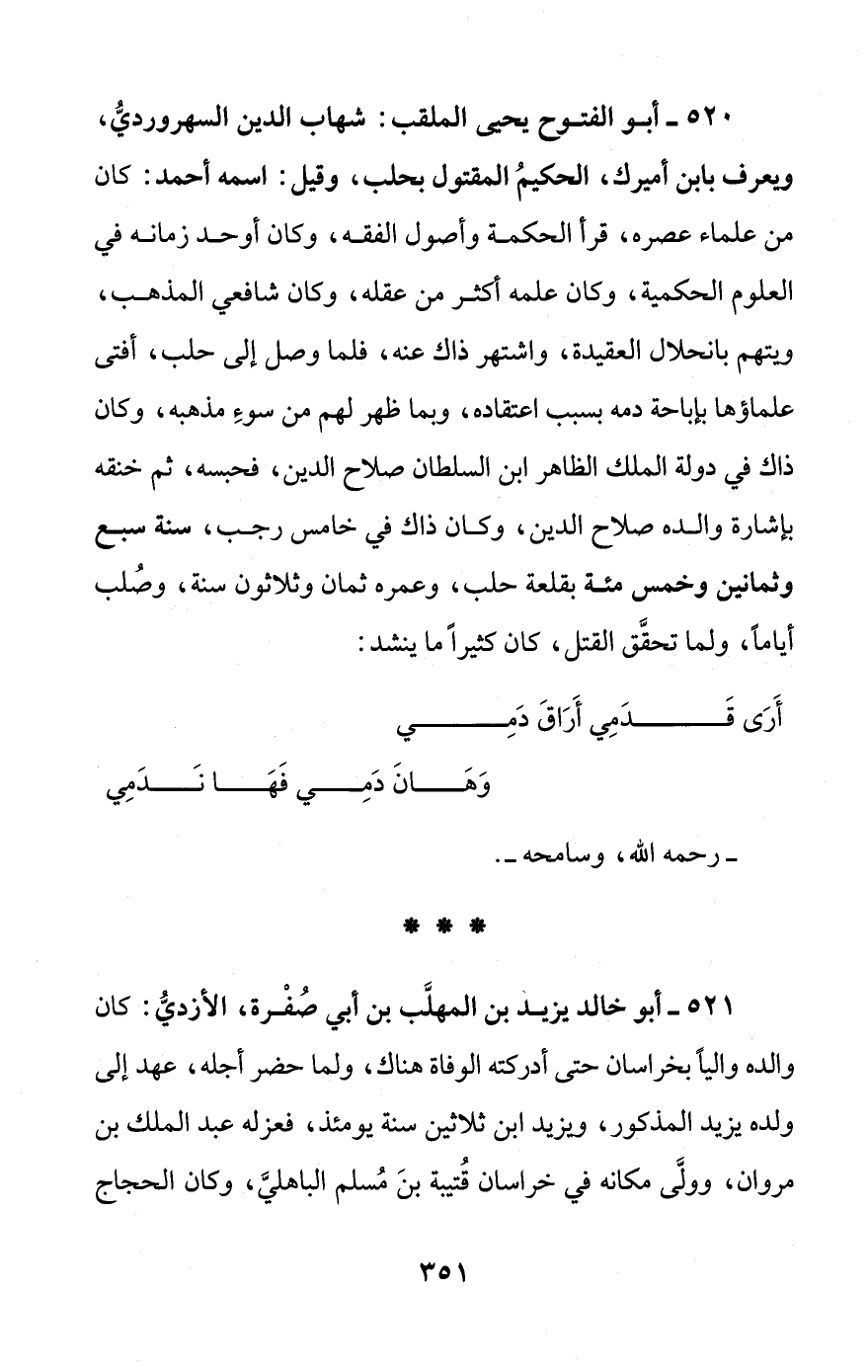 520 - أبو الفتوح يحيى الملقب: شهاب الدين السهرورديُّ، وبعرف بابن أميرك، الحكيمُ المقتول بحلب، وقيل: اسمه أحمد: كان من علماء عصره، قرأ الحكمة وأصول الفقه، وكان أوحد زمانه في العلوم الحكمية، وكان علمه أكثر من عقله، وكان شافعي المذهب، ويتهم بانحلال العقيدة، واشتهر ذاك عنه، فلما وصل إلى حلب، أفتى علماؤها بإباحة دمه بسبب اعتقاده، وبما ظهر لهم من سوءِ مذهبه، وكان ذاك في دولة الملك الظاهر ابن السلطان صلاح الدين، فحبسه، ثم خنقه بإشارة والده صلاح الدين، وكان ذاك في خامس رجب، سنة سبع وثمانين وخمس مئة بقلعة حلب، وعمره ثمان وثلاثون سنة، وصُلب أياماً، ولما تحقَّق القتل، كان كثيراً ما ينشد: