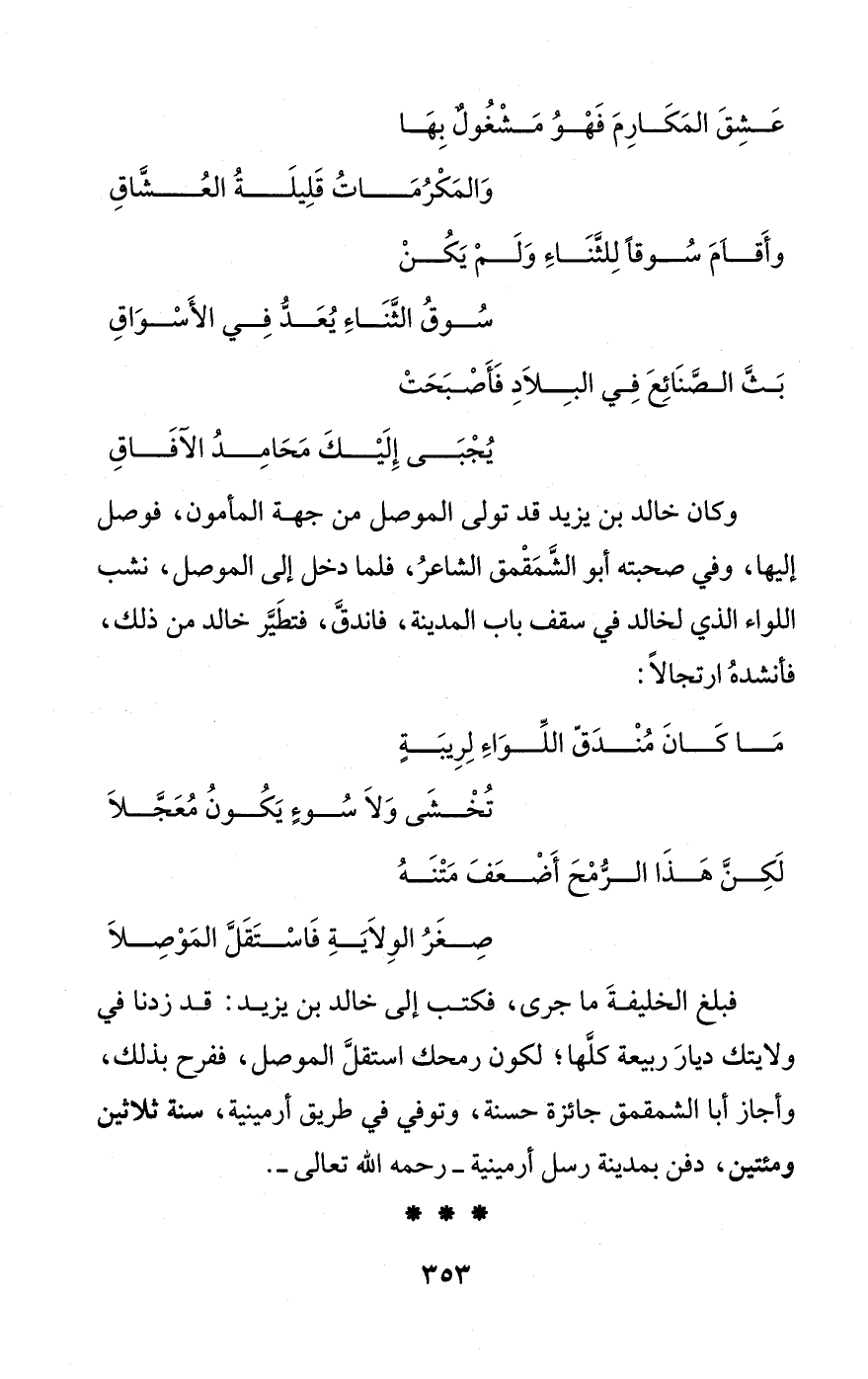 فبلغ الخليفةَ ما جرى، فكتب إلى خالد بن يزيد: قد زدنا في ولايتك ديارَ ربيعة كلَّها؛ لكون رمحك استقلَّ الموصل، ففرح بذلك، وأجاز أبا الشمقمق جائزة حسنة، وتوفي في طريق أرمينية، سنة ثلاثين ومئتين، دفن بمدينة رسل أرمينية - رحمه الله تعالى -.