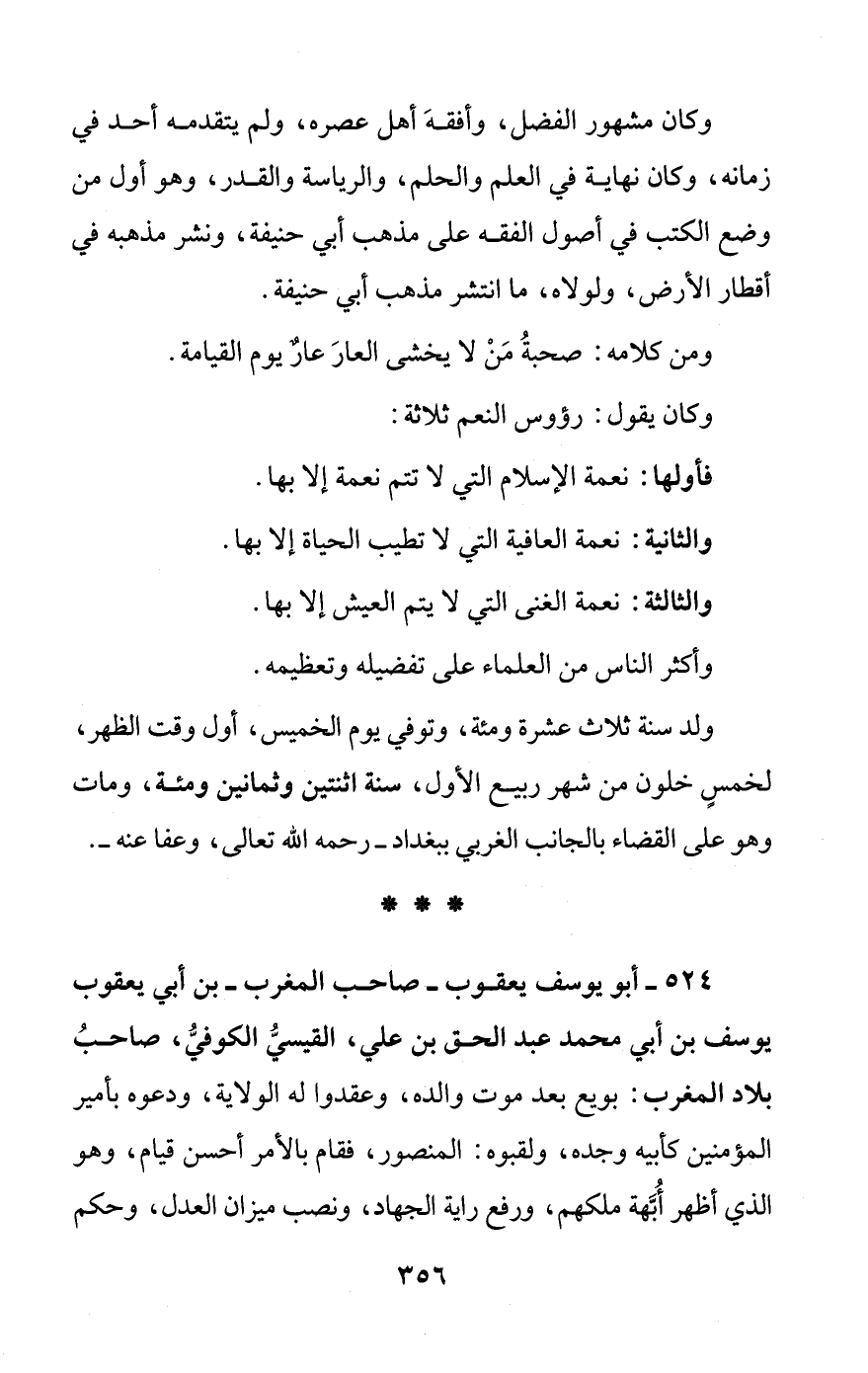 524 - أبو يوسف يعقوب - صاحب المغرب - بن أبي يعقوب يوسف بن أبي محمد عبد الحق بن علي، القيسيُّ الكوفيُّ، صاحبُ بلاد المغرب: بويع بعد موت والده، وعقدوا له الولاية، ودعوه بأمير المؤمنين كأبيه وجده، ولقبوه: المنصور، فقام بالأمر أحسن قيام، وهو الذي أظهر أُبَّهة ملكهم، ورفع راية الجهاد، ونصب ميزان العدل، وحكم
