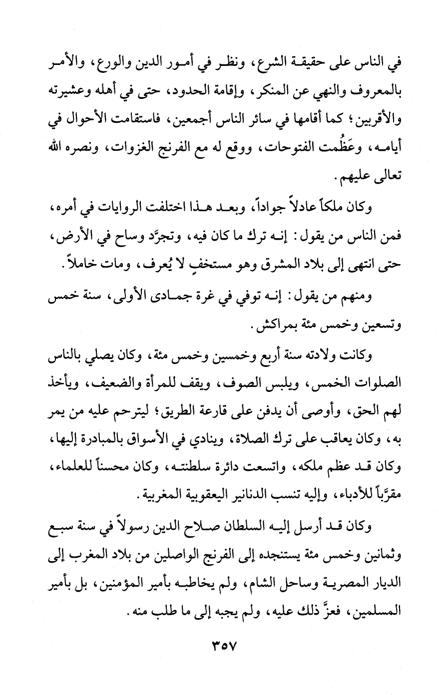 في الناس على حقيقة الشرع، ونظر في أمور الدين والورع، والأمر بالمعروف والنهي عن المنكر، وإقامة الحدود، حتى في أهله وعشيرته والأقربين؛ كما أقامها في سائر الناس أجمعين، فاستقامت الأحوال في أيامه، وعَظُمت الفتوحات، ووقع له مع الفرنج الغزوات، ونصره الله تعالى عليهم.