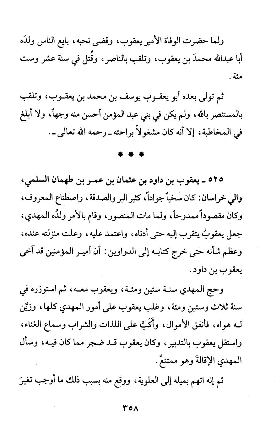 525 - يعقوب بن داود بن عثمان بن عمر بن طهمان السلمي، والي خراسان: كان سخياً جواداً، كثير البر والصدقة، واصطناع المعروف، وكان مقصوداً ممدوحًا، ولما مات المنصور، وقام بالأمر ولدُه المهدي، جعل يعقوبُ يتقرب إليه حتى أدناه، واعتمد عليه، وعلت منزلته عنده، وعظم شأنه حتى خرج كتابه إلى الدواوين: أن أمير المؤمنين قد آخى يعقوب بن داود.