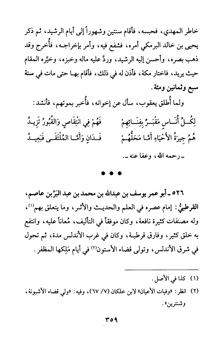 526 - أبو عمر يوسف بن عبد الله بن محمد بن عبد البَرِّبن عاصم، القرطبيُّ: إمام عصره في العلم والحديث والأثر، وما يتعلق بهم (¬1)، وله مصنفات كثيرة نافعة، وكان موفقًا في التأليف، مُعانًا عليه، وانتفع به خلق كثير، وفارق قرطبة، وكان في غرب الأندلس مدة، ثم تحول في شرق الأندلس، وتولى فضاء الأستون (¬2) في أيام مَلِكها المظفر.