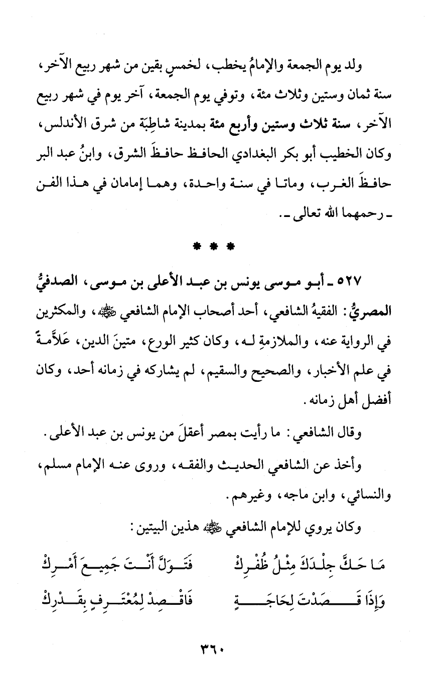 527 - أبو موسى يونس بن عبد الأعلى بن موسى، الصدفيُّ المصريُّ: الفقيهُ الشافعي، أحد أصحاب الإمام الشافعي - رضي الله عنه -، والمكثرين في الرواية عنه، والملازمةِ له، وكان كثير الورع، متينَ الدين، عَلاَّمةً في علم الأخبار، والصحيح والسقيم، لم يشاركه في زمانه أحد، وكان أفضل أهل زمانه.