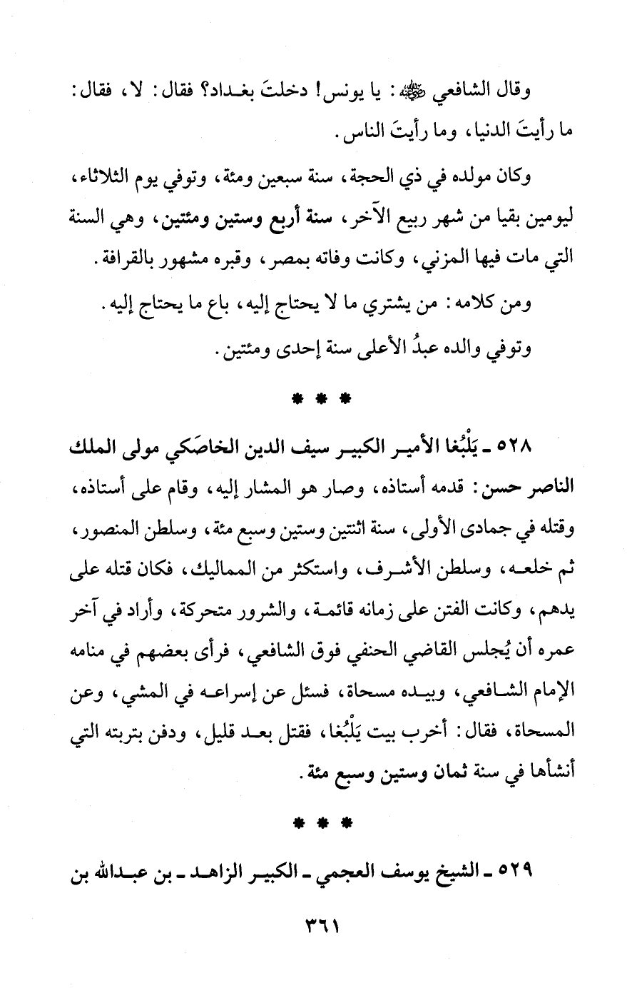 528 - يَلْبُغا الأمير الكبير سيف الدين الخاصَكي مولى الملك الناصر حسن: قدمه أستاذه، وصار هو المشار إليه، وقام على أستاذه، وقتله في جمادى الأولى، سنة اثنتين وستين وسبع مئة، وسلطن المنصور، ثم خلعه، وسلطن الأشرف، واستكثر من المماليك، فكان قتله على يدهم، وكانت الفتن على زمانه قائمة، والشرور متحركة، وأراد في آخر عمره أن يُجلس القاضي الحنفي فوق الشافعي، فرأى بعضهم في منامه الإمام الشافعي، وبيده مسحاة، فسئل عن إسراعه في المشي، وعن المسحاة، فقال: أخرب بيت يَلْبُغا، فقتل بعد قليل، ودفن بتربته التي أنشأها في سنة ثمان وستين وسبع مئة.
