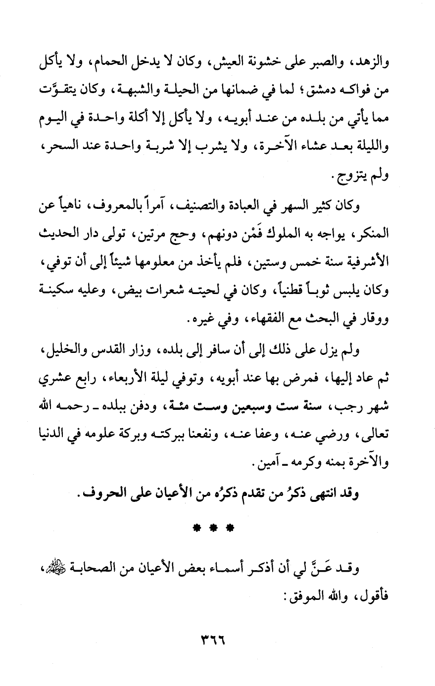 ولم يزل على ذلك إلى أن سافر إلى بلده، وزار القدس والخليل، ثم عاد إليها، فمرض بها عند أبويه، وتوفي ليلة الأربعاء، رابع عشري شهر رجب، سنة ست وسبعين وست مئة، ودفن ببلده - رحمه الله تعالى، ورضي عنه، وعفا عنه، ونفعنا ببركته وبركة علومه في الدنيا والآخرة بمنه وكرمه - أَمين.
