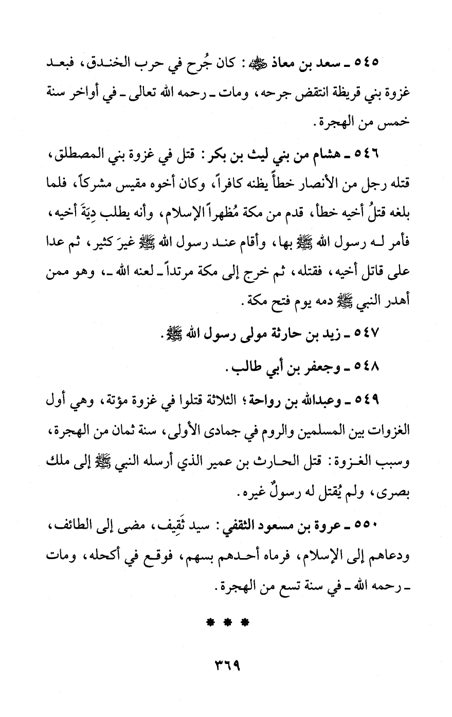 549 - وعبد الله بن رواحة؛ الثلاثة قتلوا في غزوة مؤتة، وهي أول الغزوات بين المسلمين والروم في جمادى الأولى، سنة ثمان من الهجرة، وسبب الغزوة: قتل الحارث بن عمير الذي أرسله النبي - صلى الله عليه وسلم - إلى ملك بصرى، ولم يُقتل له رسولٌ غيره.