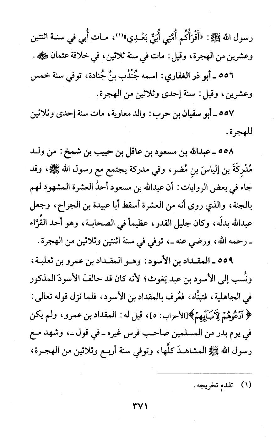 556 - أبو ذر الغفاري: اسمه جُنْدُب بنُ جُنادة، توفي سنة خمس وعشرين، وقيل: سنة إحدى وثلاثين من الهجرة.