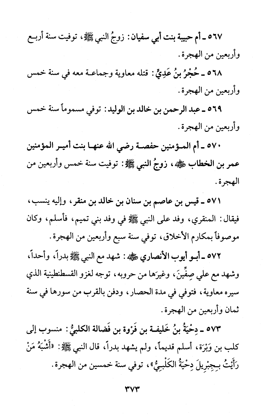 573 - دِحيَةُ بنُ خَليفة بن فَرْوة بن فَضالة الكلبيُّ: منسوب إلى كلب بن وَبْرَة، أسلم قديمًا، ولم يشهد بدرًا، قال النبي - صلى الله عليه وسلم -: "أَشْبَهُ مَنْ رَأَيْتُ بِجِبْرِيلَ دِحْيَةُ الكَلْبِيُّ"، توفي سنة خمسين من الهجرة.