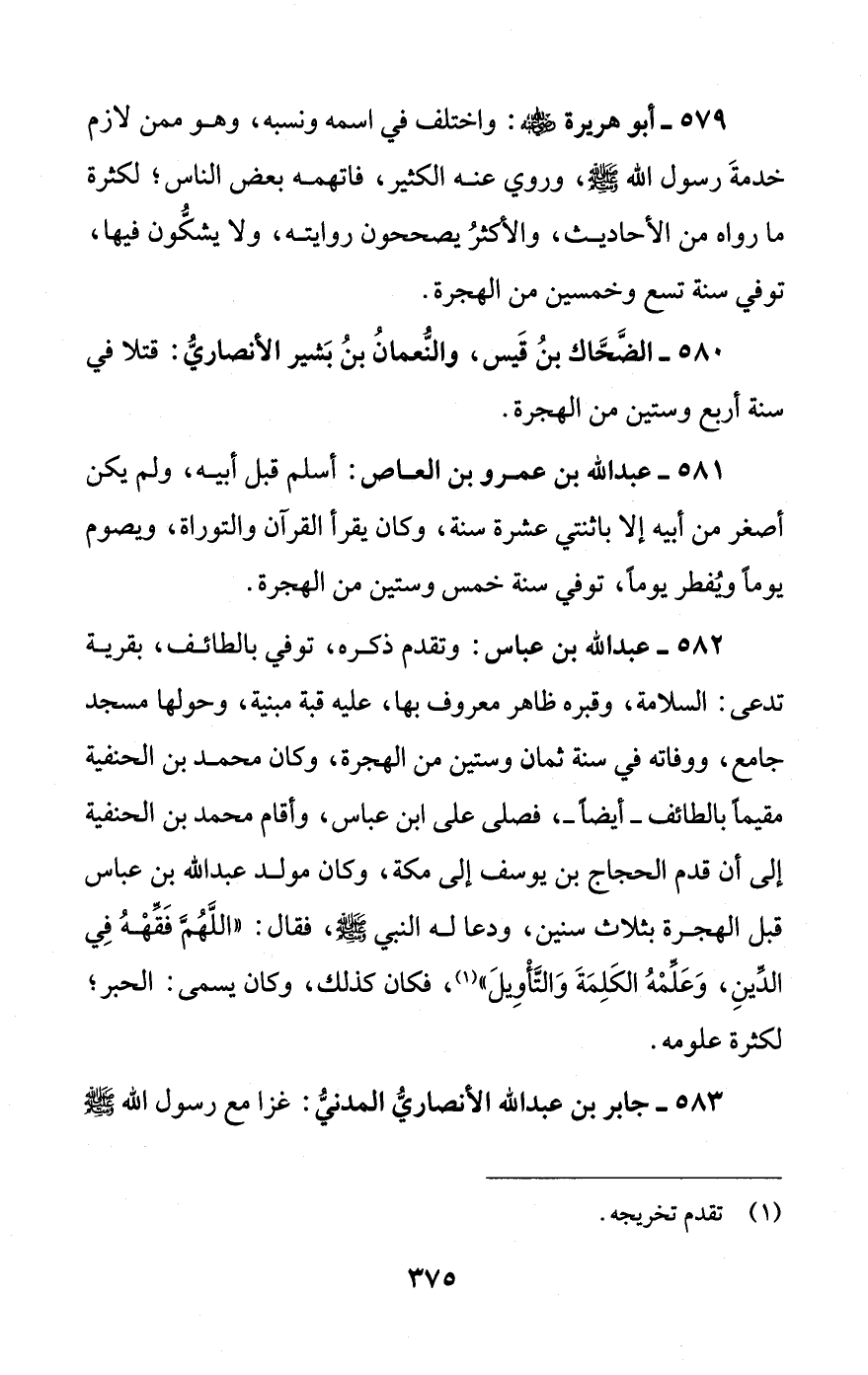 581 - عبد الله بن عمرو بن العاص: أسلم قبل أبيه، ولم يكن أصغر من أبيه إلا باثنتي عشرة سنة، وكان يقرأ القرآن والتوراة، ويصوم يومًا ويُفطر يومًا، توفي سنة خمس وستين من الهجرة.