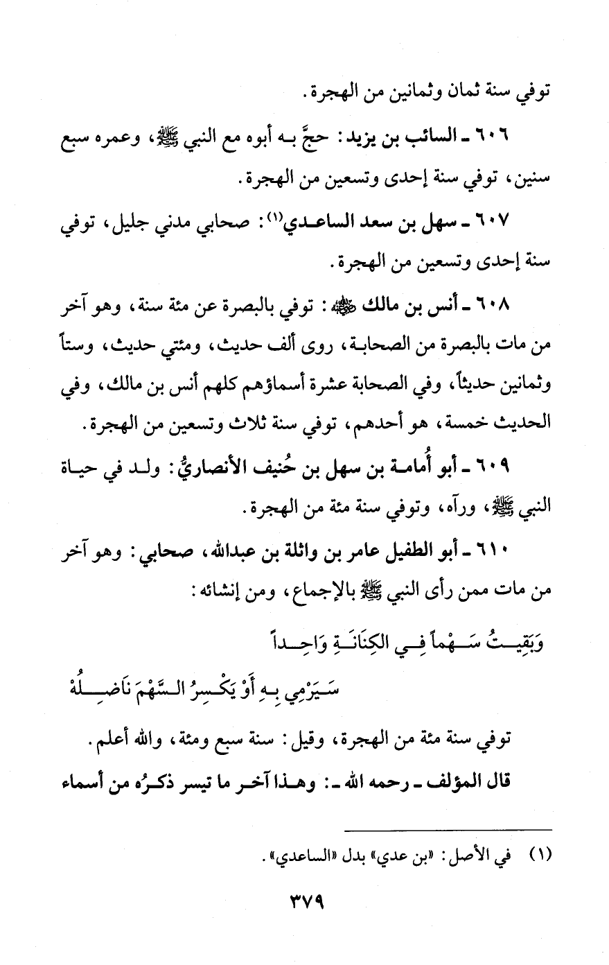 606 - السائب بن يزيد: حجَّ به أبوه مع النبي - صلى الله عليه وسلم -، وعمره سبع سنين، توفي سنة إحدى وتسعين من الهجرة.