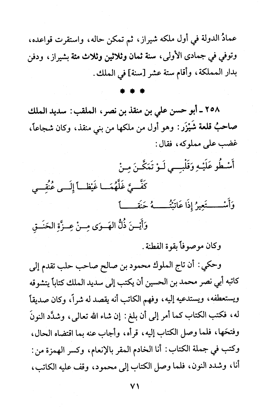 258 - أبو حسن علي بن منقذ بن نصر، الملقب: سديد الملك صاحبُ قلعة شَيْزَر: وهو أول من ملكها من بني منقذ، وكان شجاعًا، غضب على مملوكه، فقال: