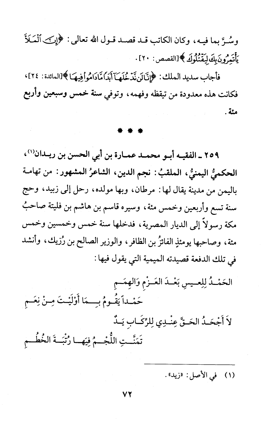 259 - الفقيه أبو محمد عمارة بن أبي الحسن بن ريدان (¬1)، الحكميُّ اليمنيُّ، الملقبُ: نجم الدين، الشاعرُ المشهور: من تهامة باليمن من مدينة يقال لها: مرطان، وبها مولده، رحل إلى زبيد، وحج سنة تسع وأربعين وخمس مئة، وسيره قاسم بن هاشم بن فليتة صاحبُ مكة رسولًا إلى الديار المصرية، فدخلها سنة خمس وخمسين وخمس مئة، وصاحبها يومئذٍ الفائزُ بن الظافر، والوزير الصالح بن رُزيك، وأنشد في تلك الدفعة قصيدته الميمية التي يقول فيها: